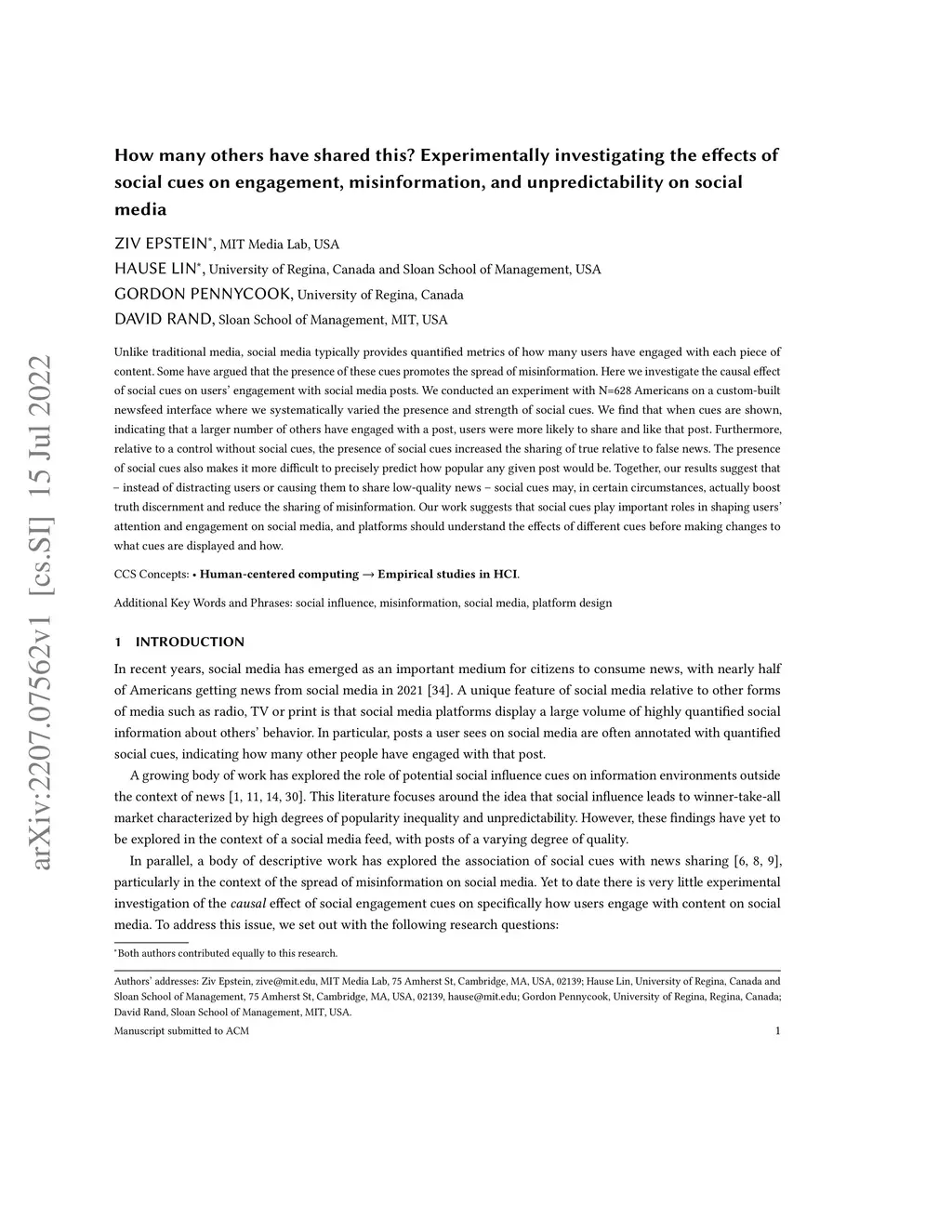 effects of social cues on engagement, misinformation, and unpredictability on