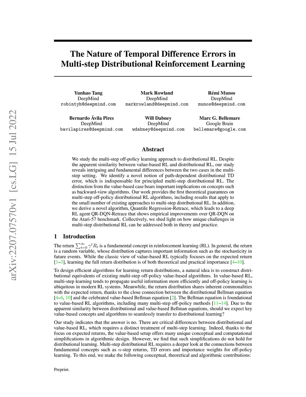 We study the multi-step off-policy learning approach to distributional RL. Despite the apparent similarity between value-based RL and distributional RL, our study reveals intriguing and fundamental differences between the two cases in the multi-step setting. We identify a novel notion of path-dependent distributional TD error, which is indispensable for principled multi-step distributional RL. The distinction from the value-based case bears important implications on concepts such as backward-view algorithms. Our work provides the first theoretical guarantees on multi-step off-policy distributional RL algorithms, including results that apply to the small number of existing approaches to multi-step distributional RL. In addition, we derive a novel algorithm, Quantile Regression-Retrace, which leads to a deep RL agent QR-DQN-Retrace that shows empirical improvements over QR-DQN on the Atari-57 benchmark. Collectively, we shed light on how unique challenges in multi-step distributional RL can be addressed both in theory and practice.