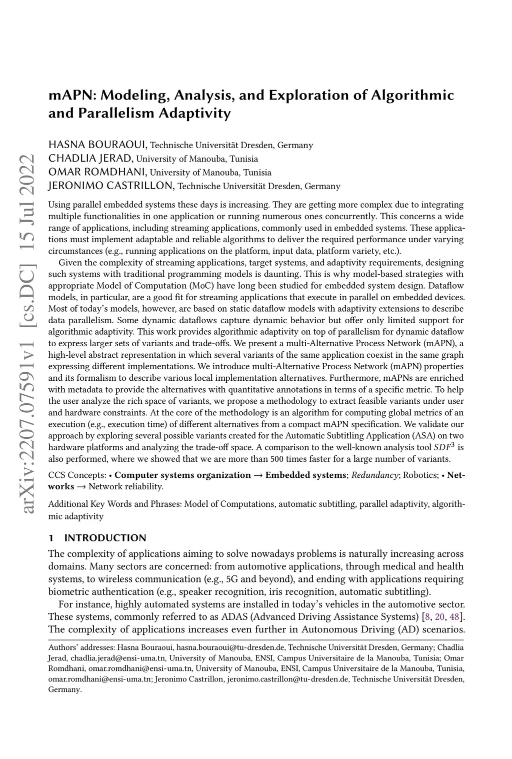 Using parallel embedded systems these days is increasing. They are getting more complex due to integrating multiple functionalities in one application or running numerous ones concurrently. This concerns a wide range of applications, including streaming applications, commonly used in embedded systems. These applications must implement adaptable and reliable algorithms to deliver the required performance under varying circumstances (e.g., running applications on the platform, input data, platform variety, etc.). Given the complexity of streaming applications, target systems, and adaptivity requirements, designing such systems with traditional programming models is daunting. This is why model-based strategies with an appropriate Model of Computation (MoC) have long been studied for embedded system design. This work provides algorithmic adaptivity on top of parallelism for dynamic dataflow to express larger sets of variants. We present a multi-Alternative Process Network (mAPN), a high-level abstract representation in which several variants of the same application coexist in the same graph expressing different implementations. We introduce mAPN properties and its formalism to describe various local implementation alternatives. Furthermore, mAPNs are enriched with metadata to Provide the alternatives with quantitative annotations in terms of a specific metric. To help the user analyze the rich space of variants, we propose a methodology to extract feasible variants under user and hardware constraints. At the core of the methodology is an algorithm for computing global metrics of an execution of different alternatives from a compact mAPN specification. We validate our approach by exploring several possible variants created for the Automatic Subtitling Application (ASA) on two hardware platforms.