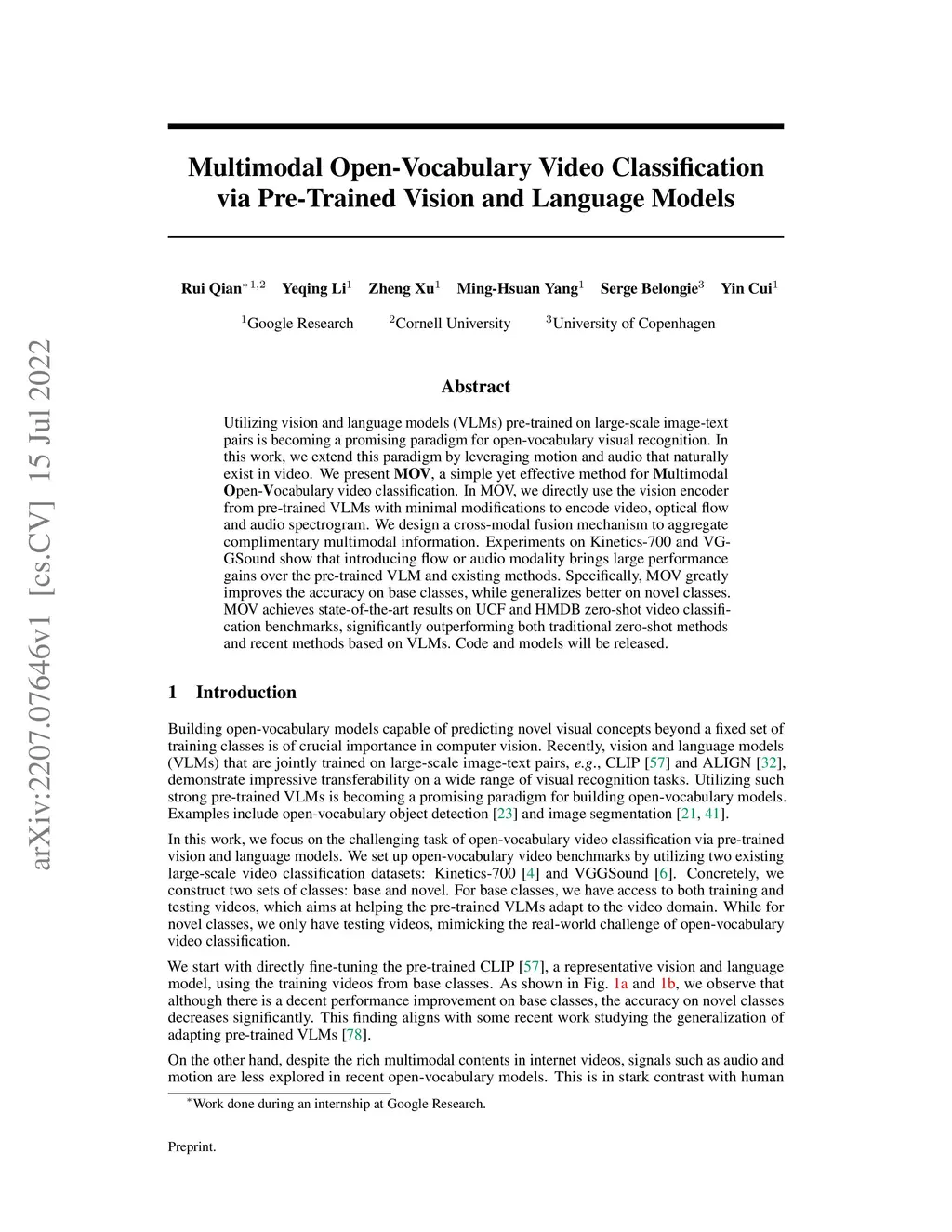Multimodal Open-Vocabulary Video Classification via Pre-Trained Vision