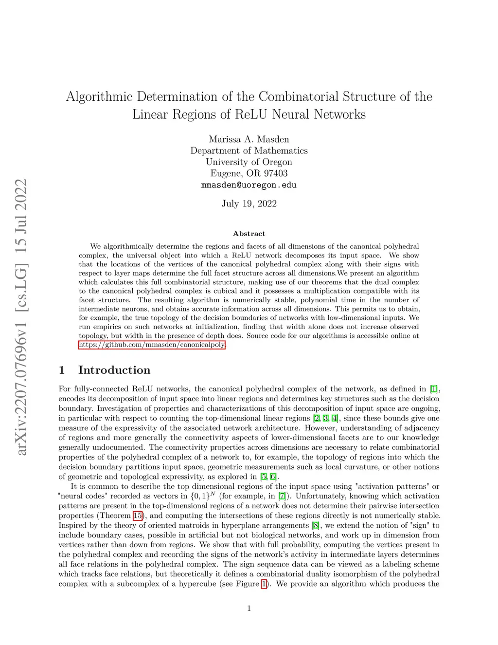We algorithmically determine the regions and facets of all dimensions of the canonical polyhedral complex, the universal object into which a ReLU network decomposes its input space. We show that the locations of the vertices of the canonical polyhedral complex along with their signs with respect to layer maps determine the full facet structure across all dimensions. We present an algorithm which calculates this full combinatorial structure, making use of our theorems that the dual complex to the canonical polyhedral complex is cubical and it possesses a multiplication compatible with its facet structure. The resulting algorithm is numerically stable, polynomial time in the number of intermediate neurons, and obtains accurate information across all dimensions. This permits us to obtain, for example, the true topology of the decision boundaries of networks with low-dimensional inputs. We run empirics on such networks at initialization, finding that width alone does not increase observed topology, but width in the presence of depth does. Source code for our algorithms is accessible online at https://github.com/mmasden/canonicalpoly.