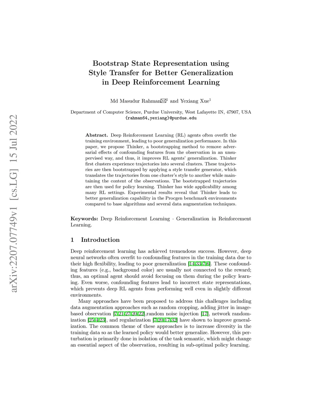 Deep Reinforcement Learning (RL) agents often overfit the training environment, leading to poor generalization performance. In this paper, we propose Thinker, a bootstrapping method to remove adversarial effects of confounding features from the observation in an unsupervised way, and thus, it improves RL agents' generalization. Thinker first clusters experience trajectories into several clusters. These trajectories are then bootstrapped by applying a style transfer generator, which translates the trajectories from one cluster's style to another while maintaining the content of the observations. The bootstrapped trajectories are then used for policy learning. Thinker has wide applicability among many RL settings. Experimental results reveal that Thinker leads to better generalization capability in the Procgen benchmark environments compared to base algorithms and several data augmentation techniques.