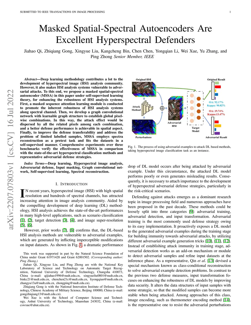 Deep learning methodology contributes a lot to the development of hyperspectral image (HSI) analysis community. However, it also makes HSI analysis systems vulnerable to adversarial attacks. To this end, we propose a masked spatial-spectral autoencoder (MSSA) in this paper under self-supervised learning theory, for enhancing the robustness of HSI analysis systems. First, a masked sequence attention learning module is conducted to promote the inherent robustness of HSI analysis systems along spectral channel. Then, we develop a graph convolutional network with learnable graph structure to establish global pixel-wise combinations.In this way, the attack effect would be dispersed by all the related pixels among each combination, and a better defense performance is achievable in spatial aspect.Finally, to improve the defense transferability and address the problem of limited labelled samples, MSSA employs spectra reconstruction as a pretext task and fits the datasets in a self-supervised manner.Comprehensive experiments over three benchmarks verify the effectiveness of MSSA in comparison with the state-of-the-art hyperspectral classification methods and representative adversarial defense strategies.