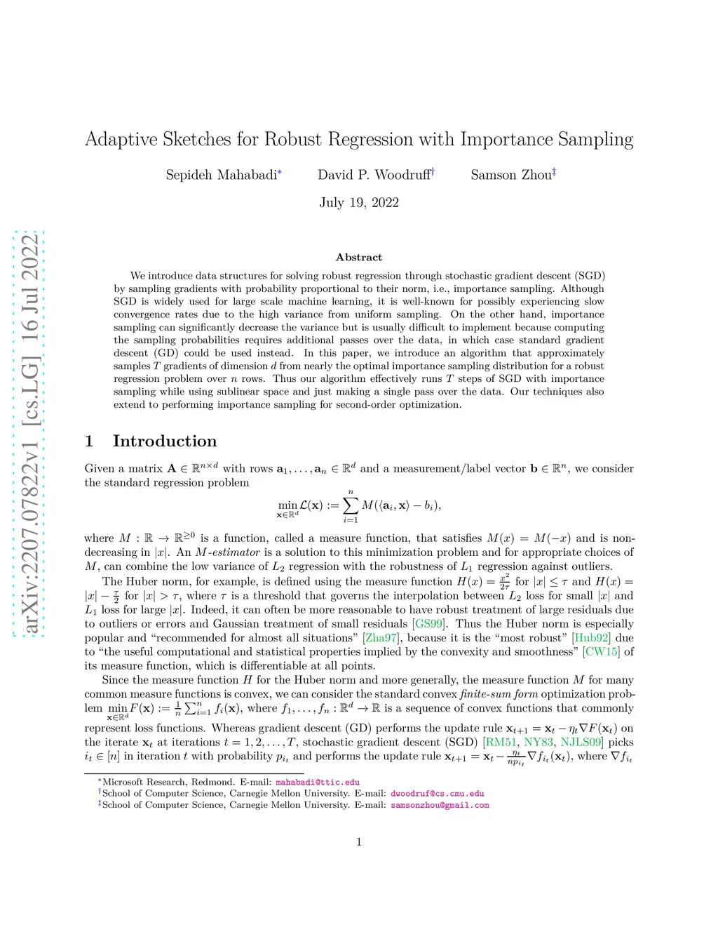 We introduce data structures for solving robust regression through stochastic gradient descent (SGD) by sampling gradients with probability proportional to their norm, i.e., importance sampling. Although SGD is widely used for large scale machine learning, it is well-known for possibly experiencing slow convergence rates due to the high variance from uniform sampling. On the other hand, importance sampling can significantly decrease the variance but is usually difficult to implement because computing the sampling probabilities requires additional passes over the data, in which case standard gradient descent (GD) could be used instead. In this paper, we introduce an algorithm that approximately samples gradients of dimension from nearly the optimal importance sampling distribution for a robust regression problem over rows. Thus our algorithm effectively runs steps of SGD with importance sampling while using sublinear space and just making a single pass over the data. Our techniques also extend to performing importance sampling for second-order optimization.