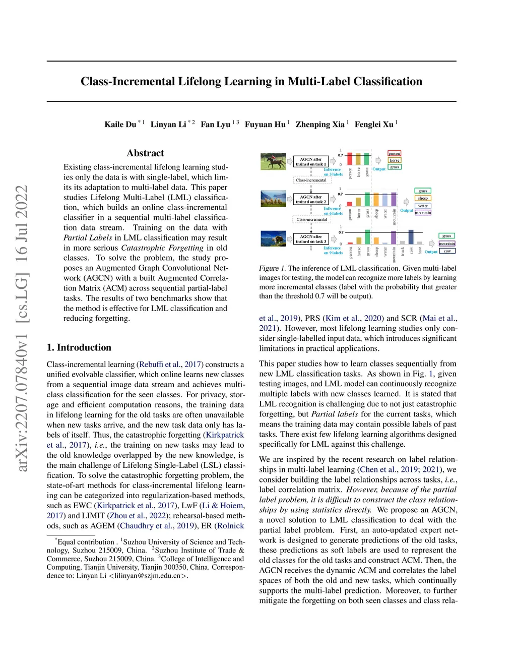 Existing class-incremental lifelong learning studies only the data is with single-label, which limits its adaptation to multi-label data. This paper studies Lifelong Multi-Label (LML) classification, which builds an online class-incremental classifier in a sequential multi-label classification data stream. Training on the data with Partial Labels in LML classification may result in more serious Catastrophic Forgetting in old classes. To solve the problem, the study proposes an Augmented Graph Convolutional Network (AGCN) with a built Augmented Correlation Matrix (ACM) across sequential partial-label tasks. The results of two benchmarks show that the method is effective for LML classification and reducing forgetting.