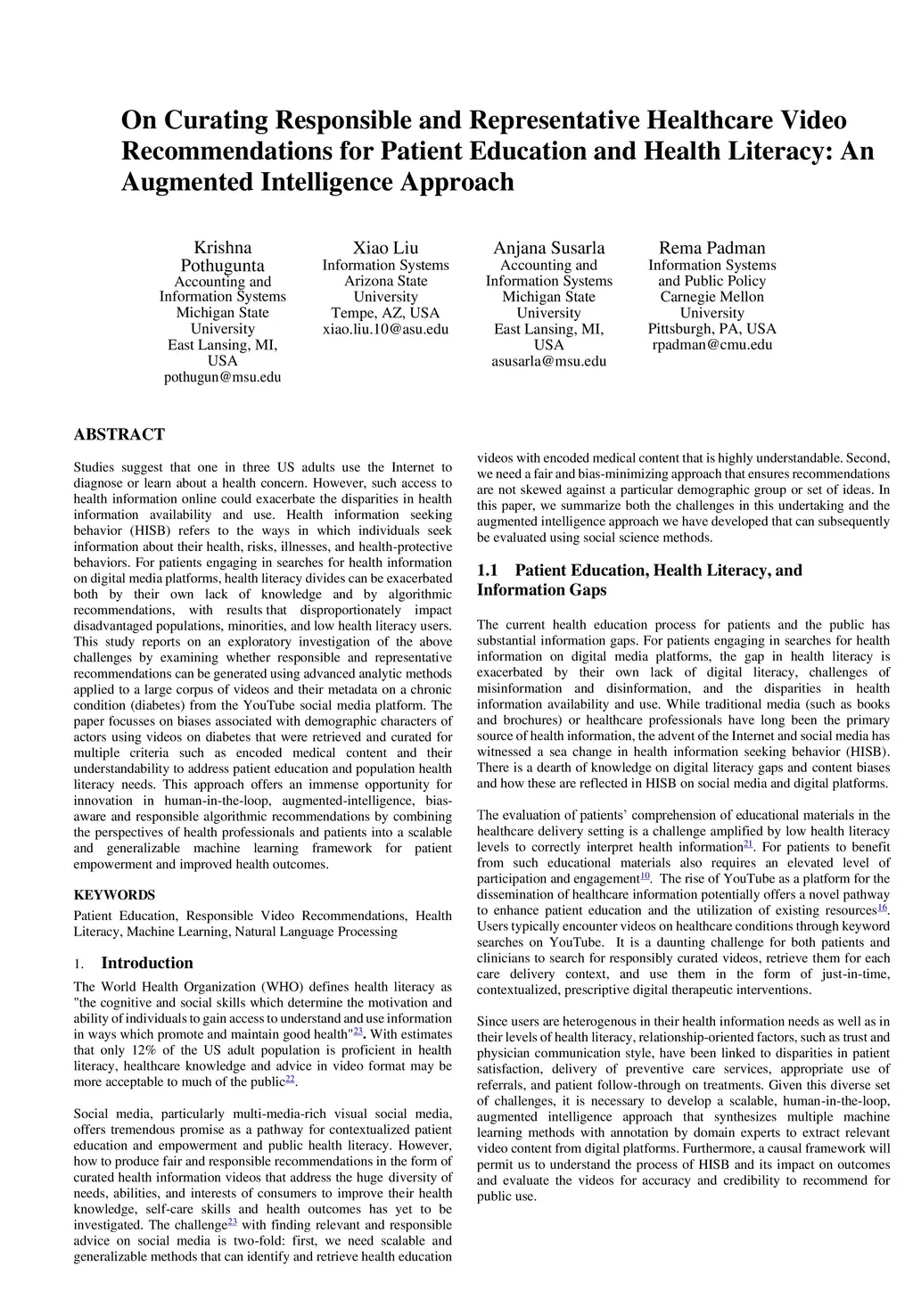 Studies suggest that one in three US adults use the Internet to diagnose or learn about a health concern. However, such access to health information online could exacerbate the disparities in health information availability and use. Health information seeking behavior (HISB) refers to the ways in which individuals seek information about their health, risks, illnesses, and health-protective behaviors. For patients engaging in searches for health information on digital media platforms, health literacy divides can be exacerbated both by their own lack of knowledge and by algorithmic recommendations, with results that disproportionately impact disadvantaged populations, minorities, and low health literacy users. This study reports on an exploratory investigation of the above challenges by examining whether responsible and representative recommendations can be generated using advanced analytic methods applied to a large corpus of videos and their metadata on a chronic condition (diabetes) from the YouTube social media platform. The paper focusses on biases associated with demographic characters of actors using videos on diabetes that were retrieved and curated for multiple criteria such as encoded medical content and their understandability to address patient education and population health literacy needs. This approach offers an immense opportunity for innovation in human-in-the-loop, augmented-intelligence, bias-aware and responsible algorithmic recommendations by combining the perspectives of health professionals and patients into a scalable and generalizable machine learning framework for patient empowerment and improved health outcomes.