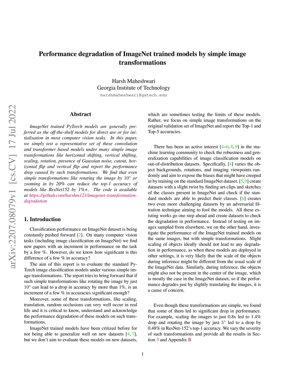 ImageNet trained PyTorch models are generally preferred as the off-the-shelf models for direct use or for initialisation in most computer vision tasks. In this paper, we simply test a representative set of these convolution and transformer based models under many simple image transformations like horizontal shifting, vertical shifting, scaling, rotation, presence of Gaussian noise, cutout, horizontal flip and vertical flip and report the performance drop caused by such transformations. We find that even simple transformations like rotating the image by 10{\deg} or zooming in by 20% can reduce the top-1 accuracy of models like ResNet152 by 1%+. The code is available at https://github.com/harshm121/imagenet-transformation-degradation.