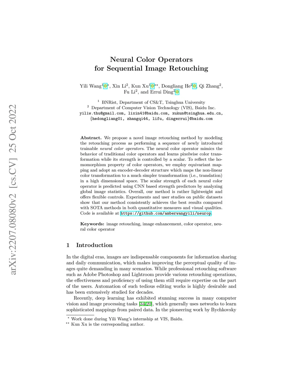 We propose a novel image retouching method by modeling the retouching process as performing a sequence of newly introduced trainable neural color operators. The neural color operator mimics the behavior of traditional color operators and learns pixelwise color transformation while its strength is controlled by a scalar. To reflect the homomorphism property of color operators, we employ equivariant mapping and adopt an encoder-decoder structure which maps the non-linear color transformation to a much simpler transformation (i.e., translation) in a high dimensional space. The scalar strength of each neural color operator is predicted using CNN based strength predictors by analyzing global image statistics. Overall, our method is rather lightweight and offers flexible controls. Experiments and user studies on public datasets show that our method consistently achieves the best results compared with SOTA methods in both quantitative measures and visual qualities. The code and pretrained models are provided at https://github.com/amberwangyili/neurop