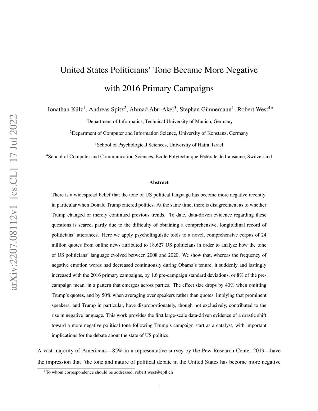 United States Politicians' Tone Became More Negative with 2016 Primary