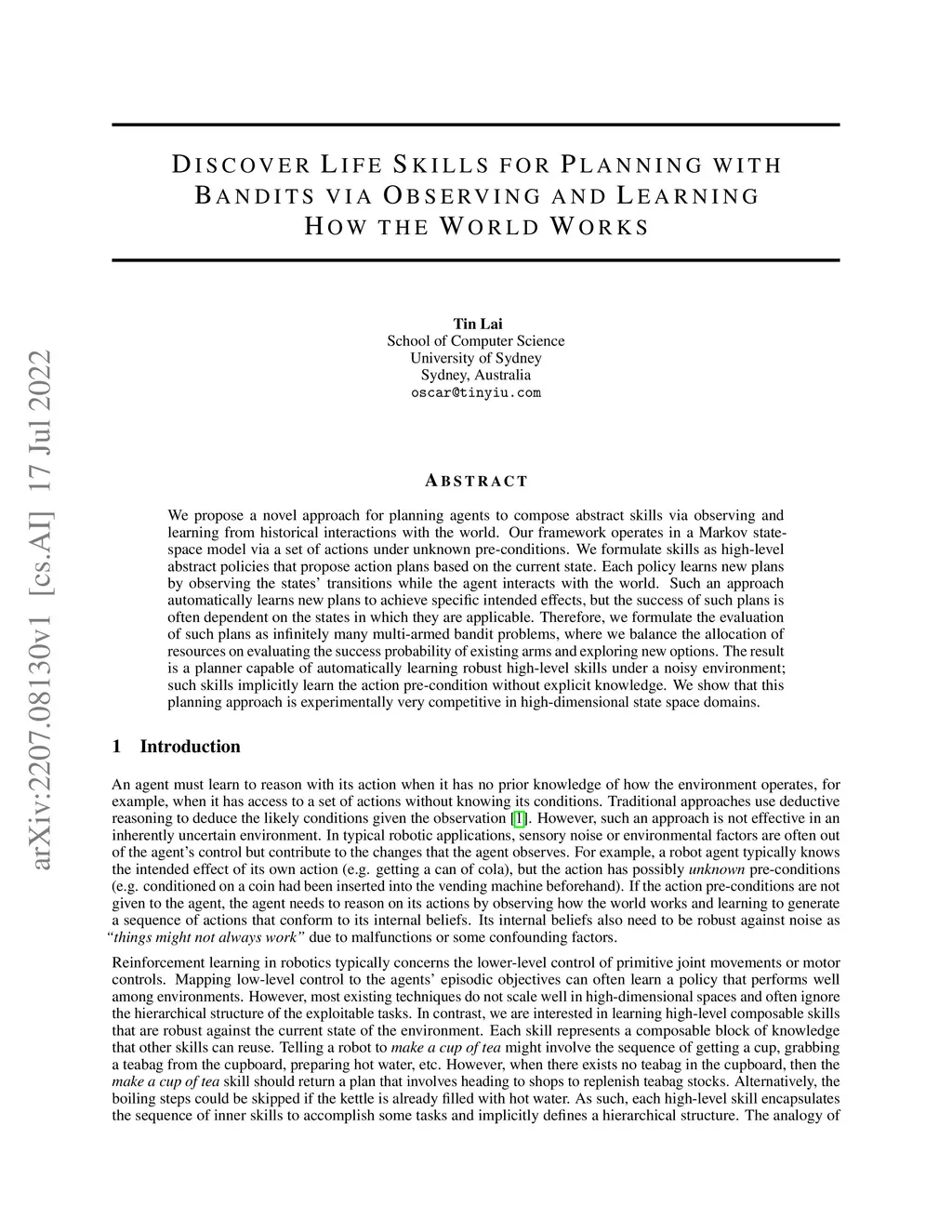 We propose a novel approach for planning agents to compose abstract skills via observing and learning from historical interactions with the world. Our framework operates in a Markov state-space model via a set of actions under unknown pre-conditions. We formulate skills as high-level abstract policies that propose action plans based on the current state. Each policy learns new plans by observing the states' transitions while the agent interacts with the world. Such an approach automatically learns new plans to achieve specific intended effects, but the success of such plans is often dependent on the states in which they are applicable. Therefore, we formulate the evaluation of such plans as infinitely many multi-armed bandit problems, where we balance the allocation of resources on evaluating the success probability of existing arms and exploring new options. The result is a planner capable of automatically learning robust high-level skills under a noisy environment; such skills implicitly learn the action pre-condition without explicit knowledge. We show that this planning approach is experimentally very competitive in high-dimensional state space domains.