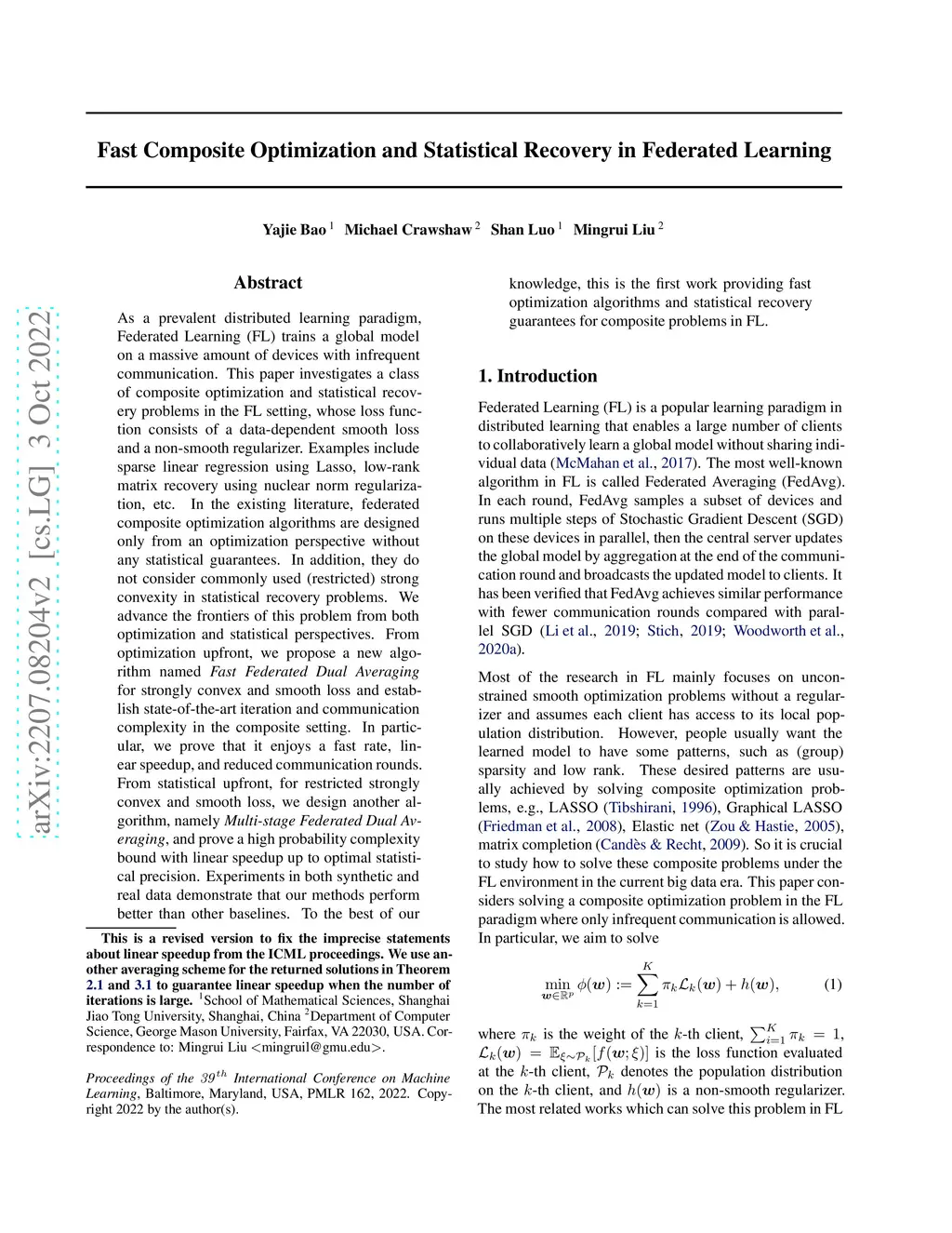 As a prevalent distributed learning paradigm, Federated Learning (FL) trains a global model on a massive amount of devices with infrequent communication. This paper investigates a class of composite optimization and statistical recovery problems in the FL setting, whose loss function consists of a data-dependent smooth loss and a non-smooth regularizer. Examples include sparse linear regression using Lasso, low-rank matrix recovery using nuclear norm regularization, etc. In the existing literature, federated composite optimization algorithms are designed only from an optimization perspective without any statistical guarantees. In addition, they do not consider commonly used (restricted) strong convexity in statistical recovery problems. We advance the frontiers of this problem from both optimization and statistical perspectives. From optimization upfront, we propose a new algorithm named \textit{Fast Federated Dual Averaging} for strongly convex and smooth loss and establish state-of-the-art iteration and communication complexity in the composite setting. In particular, we prove that it enjoys a fast rate, linear speedup, and reduced communication rounds. From statistical upfront, for restricted strongly convex and smooth loss, we design another algorithm, namely \textit{Multi-stage Federated Dual Averaging}, and prove a high probability complexity bound with linear speedup up to optimal statistical precision. Experiments in both synthetic and real data demonstrate that our methods perform better than other baselines. To the best of our knowledge, this is the first work providing fast optimization algorithms and statistical recovery guarantees for composite problems in FL.