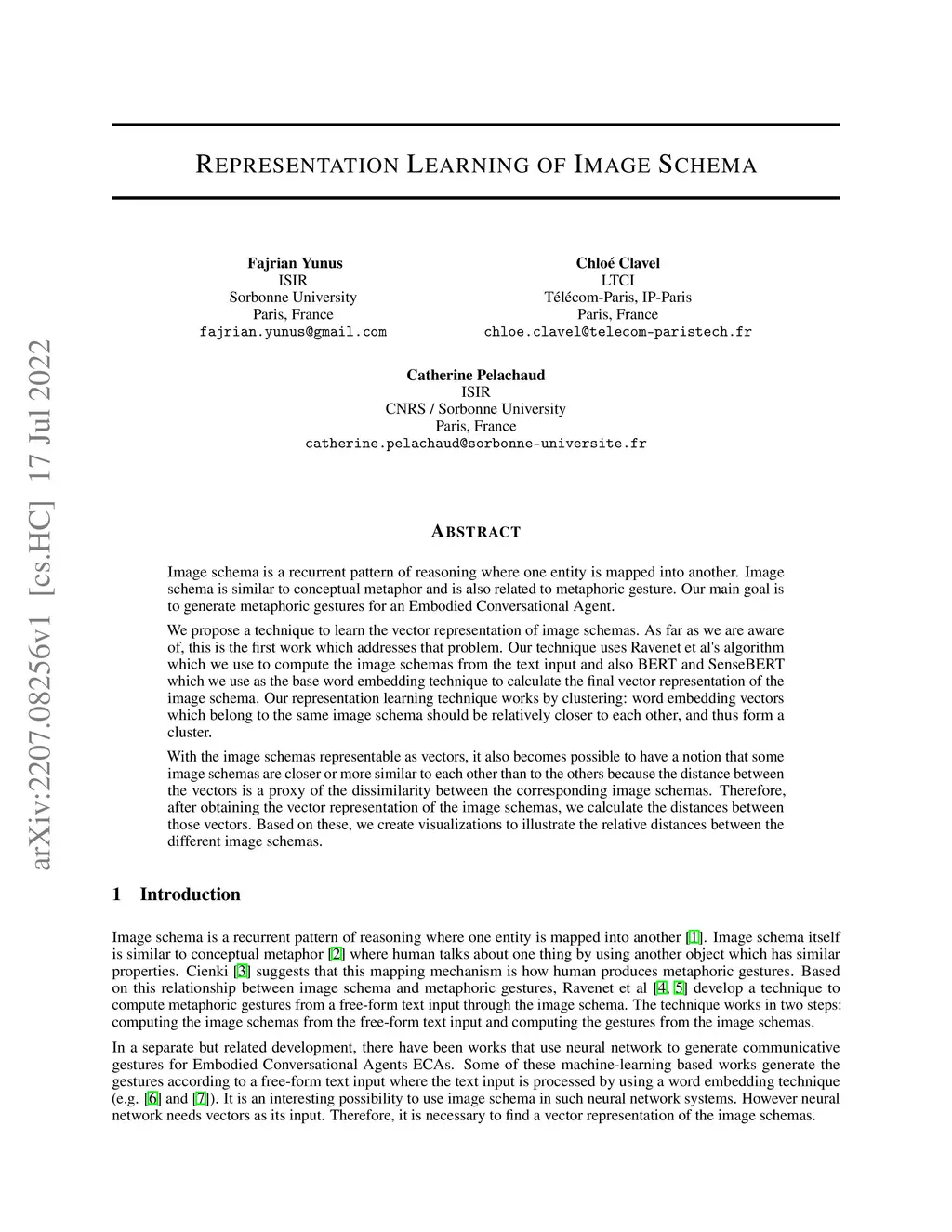 Image schema is a recurrent pattern of reasoning where one entity is mapped into another. Image schema is similar to conceptual metaphor and is also related to metaphoric gesture. Our main goal is to generate metaphoric gestures for an Embodied Conversational Agent. We propose a technique to learn the vector representation of image schemas. As far as we are aware of, this is the first work which addresses that problem. Our technique uses Ravenet et al's algorithm which we use to compute the image schemas from the text input and also BERT and SenseBERT which we use as the base word embedding technique to calculate the final vector representation of the image schema. Our representation learning technique works by clustering: word embedding vectors which belong to the same image schema should be relatively closer to each other, and thus form a cluster. With the image schemas representable as vectors, it also becomes possible to have a notion that some image schemas are closer or more similar to each other than to the others because the distance between the vectors is a proxy of the dissimilarity between the corresponding image schemas. Therefore, after obtaining the vector representation of the image schemas, we calculate the distances between those vectors. Based on these, we create visualizations to illustrate the relative distances between the different image schemas.