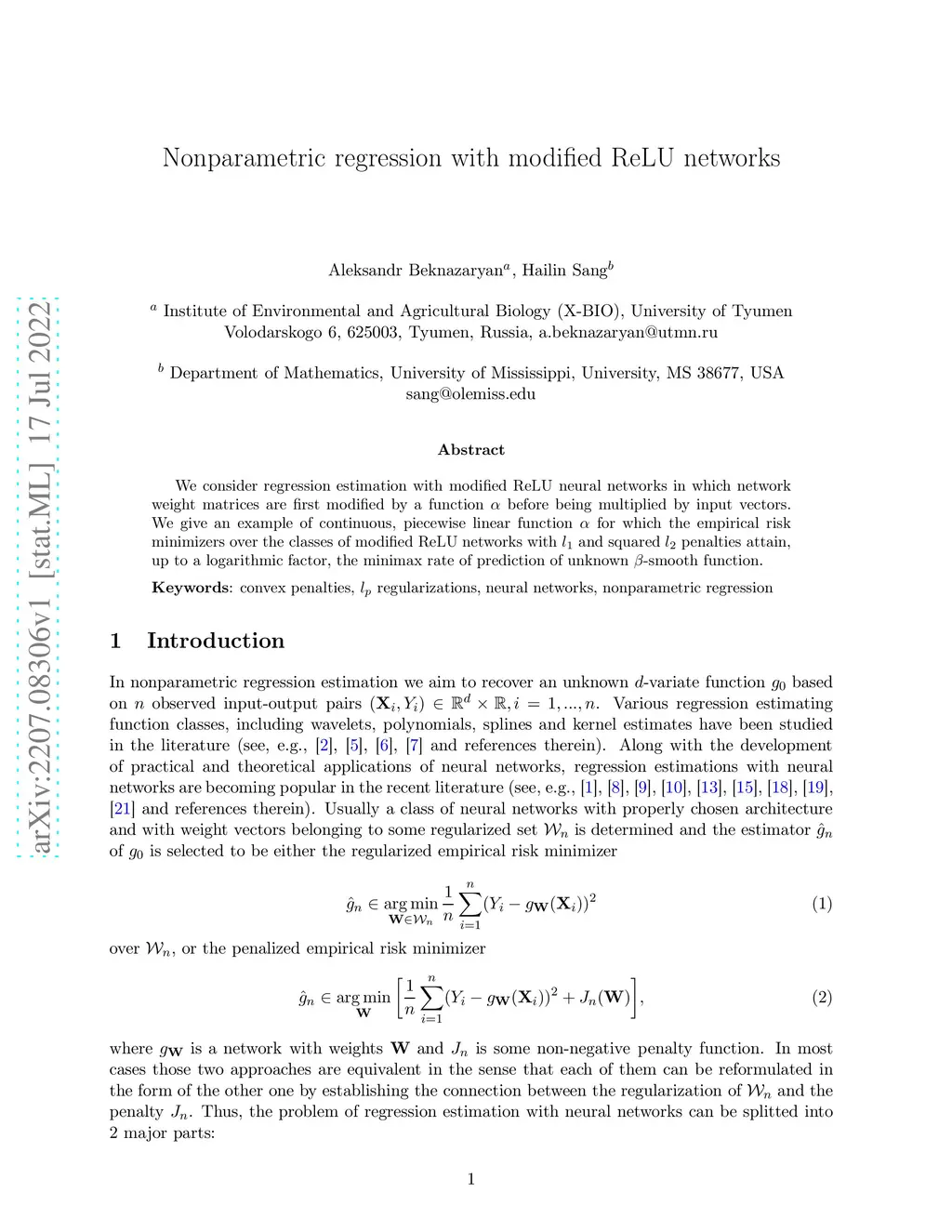 We consider regression estimation with modified ReLU neural networks in which network weight matrices are first modified by a function before being multiplied by input vectors. We give an example of continuous, piecewise linear function for which the empirical risk minimizers over the classes of modified ReLU networks with and squared penalties attain, up to a logarithmic factor, the minimax rate of prediction of unknown -smooth function.