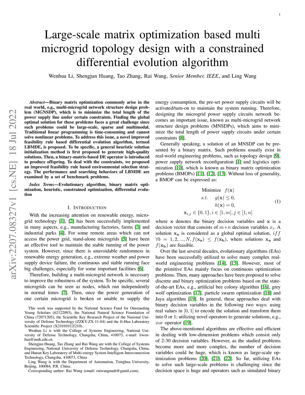 Binary matrix optimization commonly arise in the real world, e.g., multi-microgrid network structure design problem (MGNSDP), which is to minimize the total length of the power supply line under certain constraints. Finding the global optimal solution for these problems faces a great challenge since such problems could be large-scale, sparse and multimodal. Traditional linear programming is time-consuming and cannot solve nonlinear problems. To address this issue, a novel improved feasibility rule based differential evolution algorithm, termed LBMDE, is proposed. To be specific, a general heuristic solution initialization method is first proposed to generate high-quality solutions. Then, a binary-matrix-based DE operator is introduced to produce offspring. To deal with the constraints, we proposed an improved feasibility rule based environmental selection strategy. The performance and searching behaviors of LBMDE are examined by a set of benchmark problems.