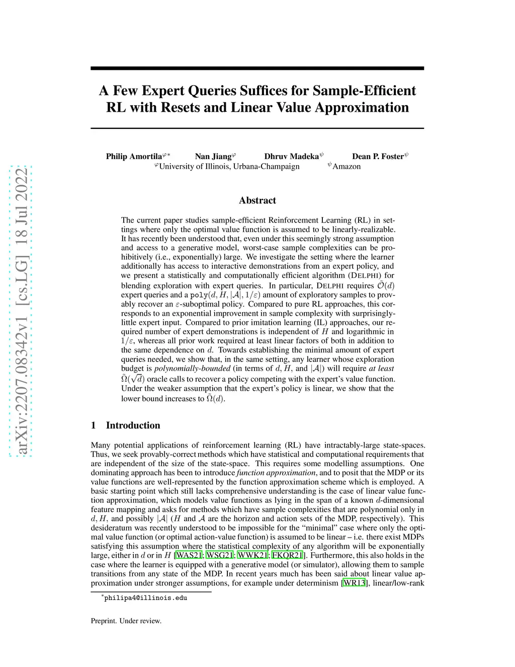 The current paper studies sample-efficient Reinforcement Learning (RL) in settings where only the optimal value function is assumed to be linearly-realizable. It has recently been understood that, even under this seemingly strong assumption and access to a generative model, worst-case sample complexities can be prohibitively (i.e., exponentially) large. We investigate the setting where the learner additionally has access to interactive demonstrations from an expert policy, and we present a statistically and computationally efficient algorithm (Delphi) for blending exploration with expert queries. In particular, Delphi requires expert queries and a amount of exploratory samples to provably recover an -suboptimal policy. Compared to pure RL approaches, this corresponds to an exponential improvement in sample complexity with surprisingly-little expert input. Compared to prior imitation learning (IL) approaches, our required number of expert demonstrations is independent of and logarithmic in , whereas all prior work required at least linear factors of both in addition to the same dependence on . Towards establishing the minimal amount of expert queries needed, we show that, in the same setting, any learner whose exploration budget is polynomially-bounded (in terms of and ) will require at least oracle calls to recover a policy competing with the expert's value function. Under the weaker assumption that the expert's policy is linear, we show that the lower bound increases to .