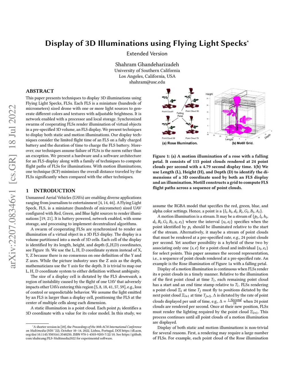 This paper presents techniques to display 3D illuminations using Flying Light Specks, FLSs. Each FLS is a miniature (hundreds of micrometers) sized drone with one or more light sources to generate different colors and textures with adjustable brightness. It is network enabled with a processor and local storage. Synchronized swarms of cooperating FLSs render illumination of virtual objects in a pre-specified 3D volume, an FLS display. We present techniques to display both static and motion illuminations. Our display techniques consider the limited flight time of an FLS on a fully charged battery and the duration of time to charge the FLS battery. Moreover, our techniques assume failure of FLSs is the norm rather than an exception. We present a hardware and a software architecture for an FLS-display along with a family of techniques to compute flight paths of FLSs for illuminations. With motion illuminations, one technique (ICF) minimizes the overall distance traveled by the FLSs significantly when compared with the other techniques.