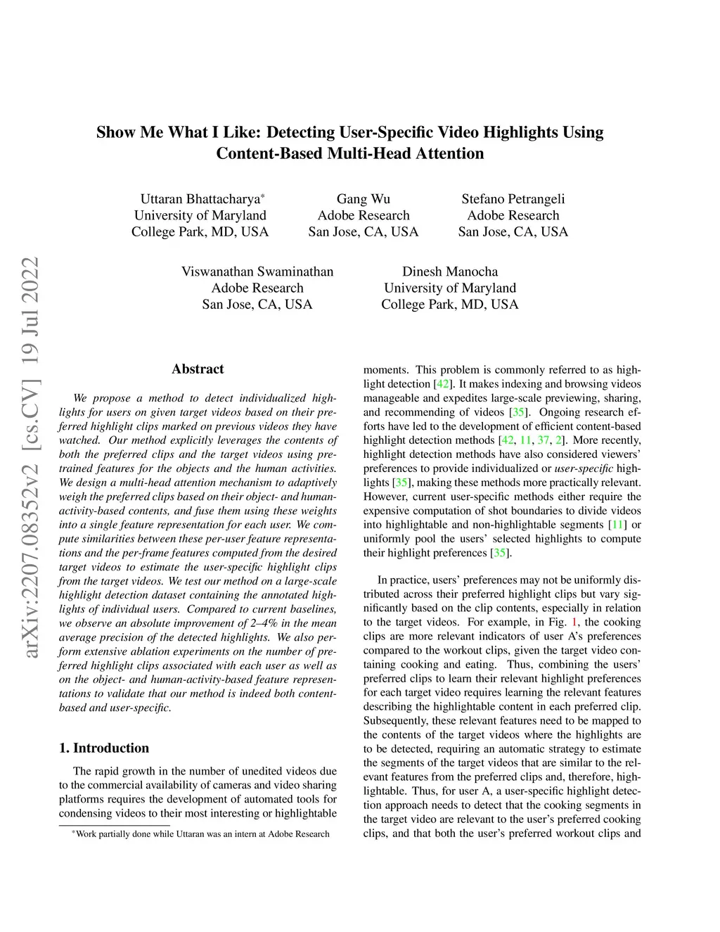 We propose a method to detect individualized highlights for users on given target videos based on their preferred highlight clips marked on previous videos they have watched. Our method explicitly leverages the contents of both the preferred clips and the target videos using pre-trained features for the objects and the human activities. We design a multi-head attention mechanism to adaptively weigh the preferred clips based on their object- and human-activity-based contents, and fuse them using these weights into a single feature representation for each user. We compute similarities between these per-user feature representations and the per-frame features computed from the desired target videos to estimate the user-specific highlight clips from the target videos. We test our method on a large-scale highlight detection dataset containing the annotated highlights of individual users. Compared to current baselines, we observe an absolute improvement of 2-4% in the mean average precision of the detected highlights. We also perform extensive ablation experiments on the number of preferred highlight clips associated with each user as well as on the object- and human-activity-based feature representations to validate that our method is indeed both content-based and user-specific.