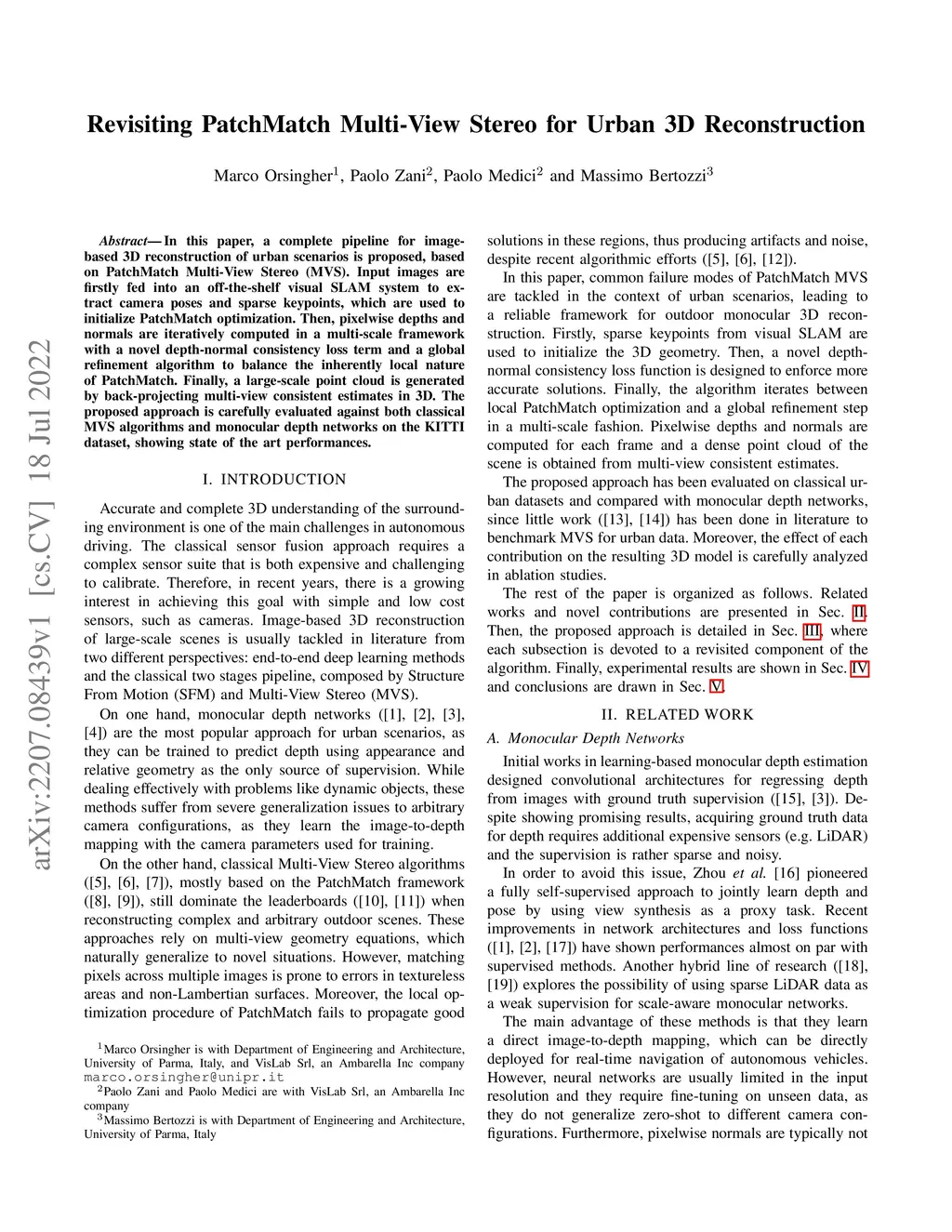 In this paper, a complete pipeline for image-based 3D reconstruction of urban scenarios is proposed, based on PatchMatch Multi-View Stereo (MVS). Input images are firstly fed into an off-the-shelf visual SLAM system to extract camera poses and sparse keypoints, which are used to initialize PatchMatch optimization. Then, pixelwise depths and normals are iteratively computed in a multi-scale framework with a novel depth-normal consistency loss term and a global refinement algorithm to balance the inherently local nature of PatchMatch. Finally, a large-scale point cloud is generated by back-projecting multi-view consistent estimates in 3D. The proposed approach is carefully evaluated against both classical MVS algorithms and monocular depth networks on the KITTI dataset, showing state of the art performances.