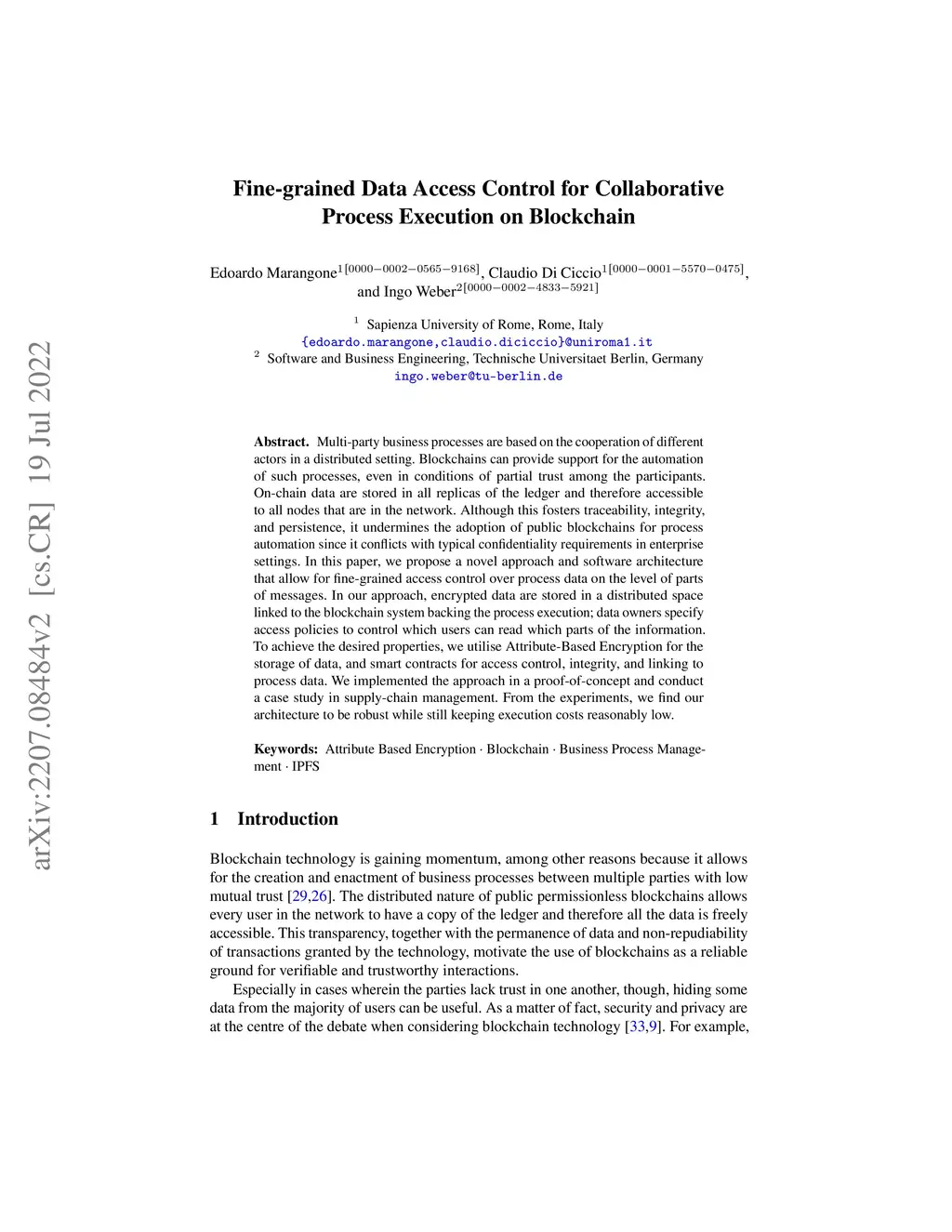 Multi-party business processes are based on the cooperation of different actors in a distributed setting. Blockchains can provide support for the automation of such processes, even in conditions of partial trust among the participants. On-chain data are stored in all replicas of the ledger and therefore accessible to all nodes that are in the network. Although this fosters traceability, integrity, and persistence, it undermines the adoption of public blockchains for process automation since it conflicts with typical confidentiality requirements in enterprise settings. In this paper, we propose a novel approach and software architecture that allow for fine-grained access control over process data on the level of parts of messages. In our approach, encrypted data are stored in a distributed space linked to the blockchain system backing the process execution; data owners specify access policies to control which users can read which parts of the information. To achieve the desired properties, we utilise Attribute-Based Encryption for the storage of data, and smart contracts for access control, integrity, and linking to process data. We implemented the approach in a proof-of-concept and conduct a case study in supply-chain management. From the experiments, we find our architecture to be robust while still keeping execution costs reasonably low.