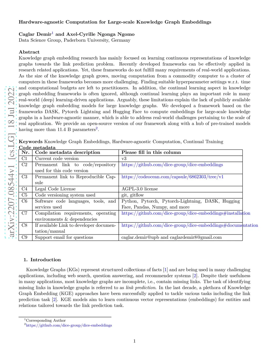 Knowledge graph embedding research has mainly focused on learning continuous representations of knowledge graphs towards the link prediction problem. Recently developed frameworks can be effectively applied in research related applications. Yet, these frameworks do not fulfill many requirements of real-world applications. As the size of the knowledge graph grows, moving computation from a commodity computer to a cluster of computers in these frameworks becomes more challenging. Finding suitable hyperparameter settings w.r.t. time and computational budgets are left to practitioners. In addition, the continual learning aspect in knowledge graph embedding frameworks is often ignored, although continual learning plays an important role in many real-world (deep) learning-driven applications. Arguably, these limitations explain the lack of publicly available knowledge graph embedding models for large knowledge graphs. We developed a framework based on the frameworks DASK, Pytorch Lightning and Hugging Face to compute embeddings for large-scale knowledge graphs in a hardware-agnostic manner, which is able to address real-world challenges pertaining to the scale of real application. We provide an open-source version of our framework along with a hub of pre-trained models having more than 11.4 B parameters.