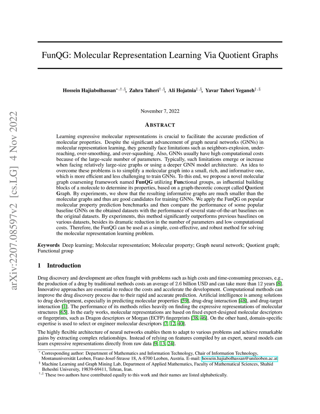 Learning expressive molecular representations is crucial to facilitate the accurate prediction of molecular properties. Despite the significant advancement of graph neural networks (GNNs) in molecular representation learning, they generally face limitations such as neighbors-explosion, under-reaching, over-smoothing, and over-squashing. Also, GNNs usually have high computational costs because of the large-scale number of parameters. Typically, such limitations emerge or increase when facing relatively large-size graphs or using a deeper GNN model architecture. An idea to overcome these problems is to simplify a molecular graph into a small, rich, and informative one, which is more efficient and less challenging to train GNNs. To this end, we propose a novel molecular graph coarsening framework named FunQG utilizing Functional groups, as influential building blocks of a molecule to determine its properties, based on a graph-theoretic concept called Quotient Graph. By experiments, we show that the resulting informative graphs are much smaller than the molecular graphs and thus are good candidates for training GNNs. We apply the FunQG on popular molecular property prediction benchmarks and then compare the performance of some popular baseline GNNs on the obtained datasets with the performance of several state-of-the-art baselines on the original datasets. By experiments, this method significantly outperforms previous baselines on various datasets, besides its dramatic reduction in the number of parameters and low computational costs. Therefore, the FunQG can be used as a simple, cost-effective, and robust method for solving the molecular representation learning problem.