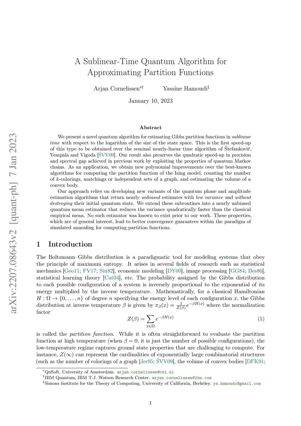 We present a novel quantum algorithm for estimating Gibbs partition functions in sublinear time with respect to the logarithm of the size of the state space. This is the first speed-up of this type to be obtained over the seminal nearly-linear time algorithm of \v{S}tefankovi\v{c}, Vempala and Vigoda [JACM, 2009]. Our result also preserves the quadratic speed-up in precision and spectral gap achieved in previous work by exploiting the properties of quantum Markov chains. As an application, we obtain new polynomial improvements over the best-known algorithms for computing the partition function of the Ising model, counting the number of -colorings, matchings or independent sets of a graph, and estimating the volume of a convex body. Our approach relies on developing new variants of the quantum phase and amplitude estimation algorithms that return nearly unbiased estimates with low variance and without destroying their initial quantum state. We extend these subroutines into a nearly unbiased quantum mean estimator that reduces the variance quadratically faster than the classical empirical mean. No such estimator was known to exist prior to our work. These properties, which are of general interest, lead to better convergence guarantees within the paradigm of simulated annealing for computing partition functions.