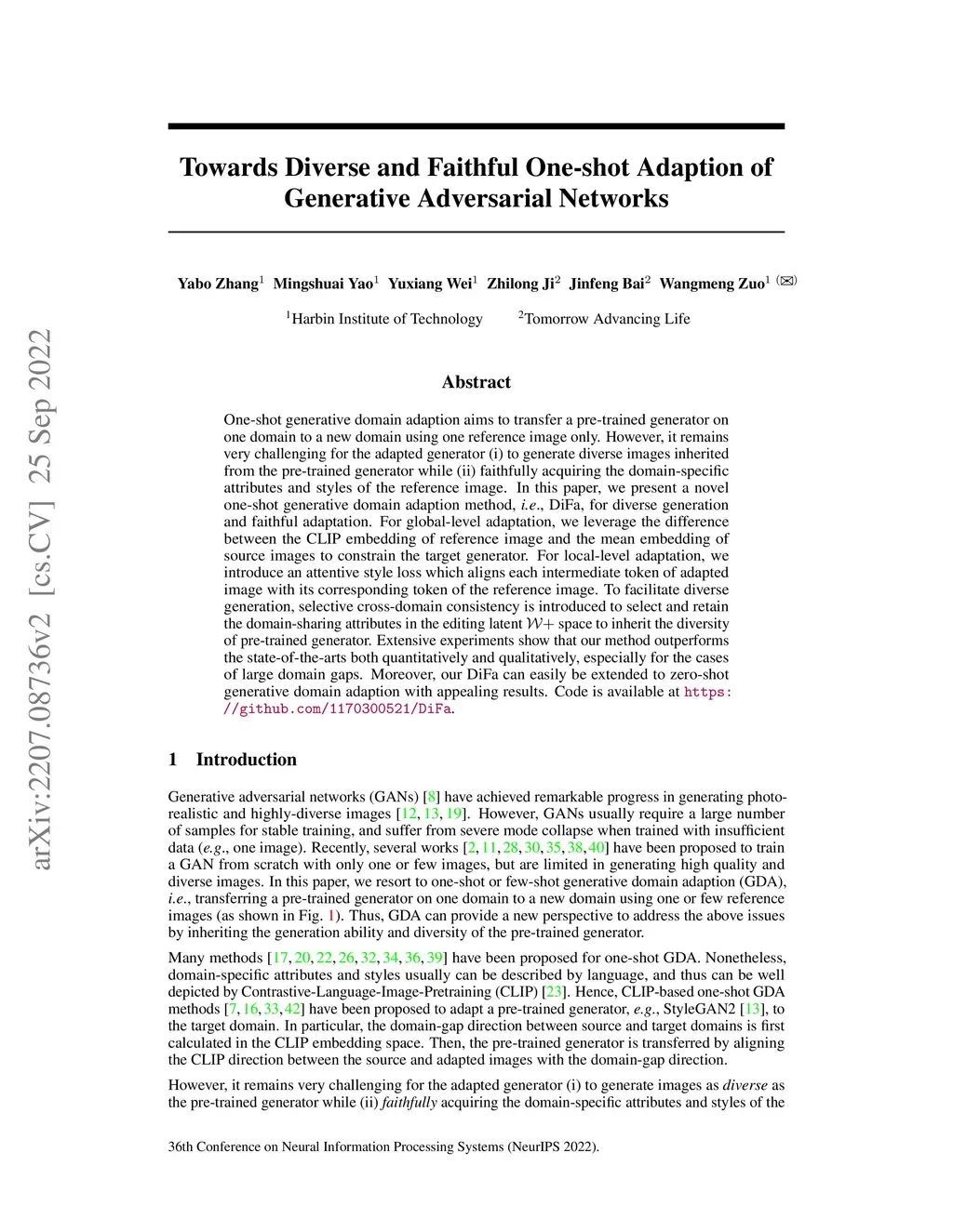 One-shot generative domain adaption aims to transfer a pre-trained generator on one domain to a new domain using one reference image only. However, it remains very challenging for the adapted generator (i) to generate diverse images inherited from the pre-trained generator while (ii) faithfully acquiring the domain-specific attributes and styles of the reference image. In this paper, we present a novel one-shot generative domain adaption method, i.e., DiFa, for diverse generation and faithful adaptation. For global-level adaptation, we leverage the difference between the CLIP embedding of reference image and the mean embedding of source images to constrain the target generator. For local-level adaptation, we introduce an attentive style loss which aligns each intermediate token of adapted image with its corresponding token of the reference image. To facilitate diverse generation, selective cross-domain consistency is introduced to select and retain the domain-sharing attributes in the editing latent space to inherit the diversity of pre-trained generator. Extensive experiments show that our method outperforms the state-of-the-arts both quantitatively and qualitatively, especially for the cases of large domain gaps. Moreover, our DiFa can easily be extended to zero-shot generative domain adaption with appealing results. Code is available at https://github.com/1170300521/DiFa.
