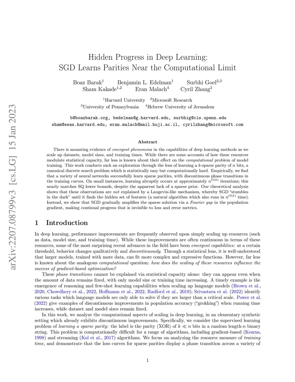 There is mounting evidence of emergent phenomena in the capabilities of deep learning methods as we scale up datasets, model sizes, and training times. While there are some accounts of how these resources modulate statistical capacity, far less is known about their effect on the computational problem of model training. This work conducts such an exploration through the lens of learning a -sparse parity of bits, a canonical discrete search problem which is statistically easy but computationally hard. Empirically, we find that a variety of neural networks successfully learn sparse parities, with discontinuous phase transitions in the training curves. On small instances, learning abruptly occurs at approximately iterations; this nearly matches SQ lower bounds, despite the apparent lack of a sparse prior. Our theoretical analysis shows that these observations are not explained by a Langevin-like mechanism, whereby SGD "stumbles in the dark" until it finds the hidden set of features (a natural algorithm which also runs in time). Instead, we show that SGD gradually amplifies the sparse solution via a Fourier gap in the population gradient, making continual progress that is invisible to loss and error metrics.