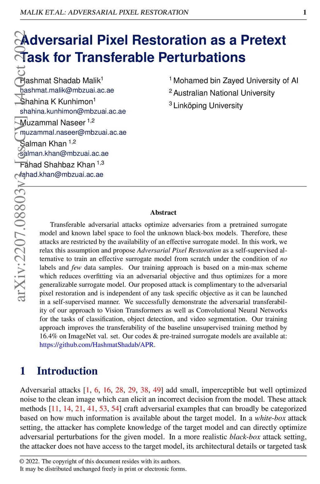 Transferable adversarial attacks optimize adversaries from a pretrained surrogate model and known label space to fool the unknown black-box models. Therefore, these attacks are restricted by the availability of an effective surrogate model. In this work, we relax this assumption and propose Adversarial Pixel Restoration as a self-supervised alternative to train an effective surrogate model from scratch under the condition of no labels and few data samples. Our training approach is based on a min-max scheme which reduces overfitting via an adversarial objective and thus optimizes for a more generalizable surrogate model. Our proposed attack is complimentary to the adversarial pixel restoration and is independent of any task specific objective as it can be launched in a self-supervised manner. We successfully demonstrate the adversarial transferability of our approach to Vision Transformers as well as Convolutional Neural Networks for the tasks of classification, object detection, and video segmentation. Our training approach improves the transferability of the baseline unsupervised training method by 16.4% on ImageNet val. set. Our codes & pre-trained surrogate models are available at: https://github.com/HashmatShadab/APR