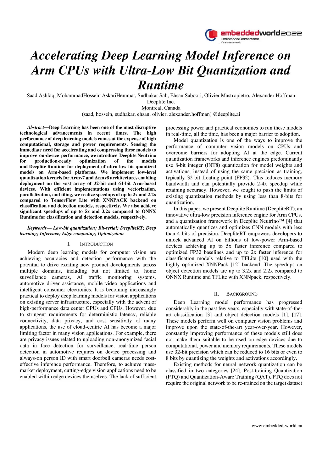 Deep Learning has been one of the most disruptive technological advancements in recent times. The high performance of deep learning models comes at the expense of high computational, storage and power requirements. Sensing the immediate need for accelerating and compressing these models to improve on-device performance, we introduce Deeplite Neutrino for production-ready optimization of the models and Deeplite Runtime for deployment of ultra-low bit quantized models on Arm-based platforms. We implement low-level quantization kernels for Armv7 and Armv8 architectures enabling deployment on the vast array of 32-bit and 64-bit Arm-based devices. With efficient implementations using vectorization, parallelization, and tiling, we realize speedups of up to 2x and 2.2x compared to TensorFlow Lite with XNNPACK backend on classification and detection models, respectively. We also achieve significant speedups of up to 5x and 3.2x compared to ONNX Runtime for classification and detection models, respectively.
