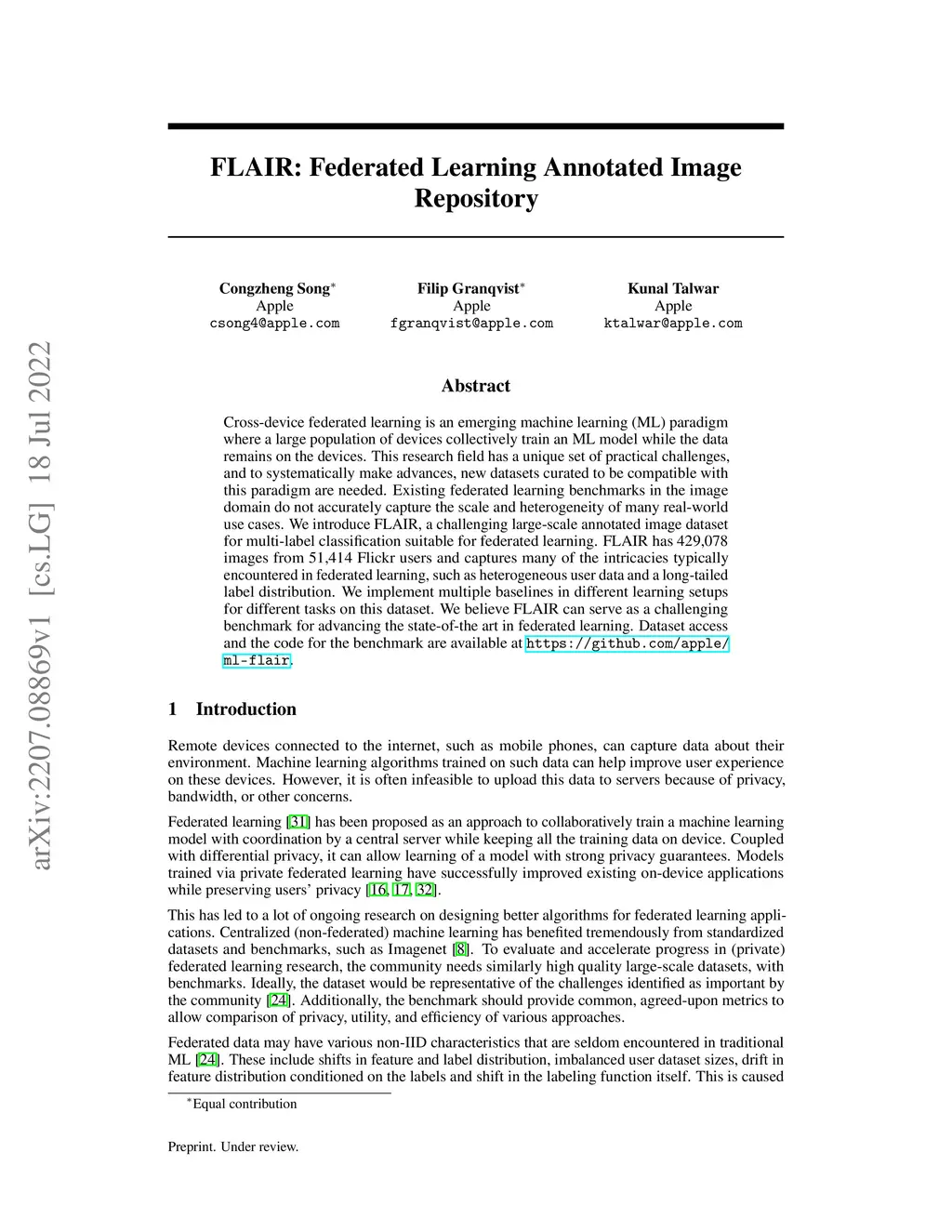 Cross-device federated learning is an emerging machine learning (ML) paradigm where a large population of devices collectively train an ML model while the data remains on the devices. This research field has a unique set of practical challenges, and to systematically make advances, new datasets curated to be compatible with this paradigm are needed. Existing federated learning benchmarks in the image domain do not accurately capture the scale and heterogeneity of many real-world use cases. We introduce FLAIR, a challenging large-scale annotated image dataset for multi-label classification suitable for federated learning. FLAIR has 429,078 images from 51,414 Flickr users and captures many of the intricacies typically encountered in federated learning, such as heterogeneous user data and a long-tailed label distribution. We implement multiple baselines in different learning setups for different tasks on this dataset. We believe FLAIR can serve as a challenging benchmark for advancing the state-of-the art in federated learning. Dataset access and the code for the benchmark are available at \url{https://github.com/apple/ml-flair}.