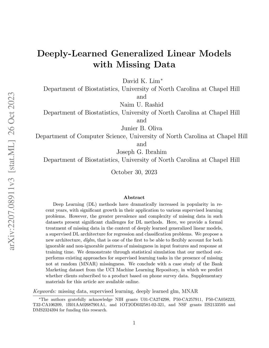 Deep Learning (DL) methods have dramatically increased in popularity in recent years, with significant growth in their application to supervised learning problems in the biomedical sciences. However, the greater prevalence and complexity of missing data in modern biomedical datasets present significant challenges for DL methods. Here, we provide a formal treatment of missing data in the context of deeply learned generalized linear models, a supervised DL architecture for regression and classification problems. We propose a new architecture, \textit{dlglm}, that is one of the first to be able to flexibly account for both ignorable and non-ignorable patterns of missingness in input features and response at training time. We demonstrate through statistical simulation that our method outperforms existing approaches for supervised learning tasks in the presence of missing not at random (MNAR) missingness. We conclude with a case study of a Bank Marketing dataset from the UCI Machine Learning Repository, in which we predict whether clients subscribed to a product based on phone survey data. Supplementary materials for this article are available online.