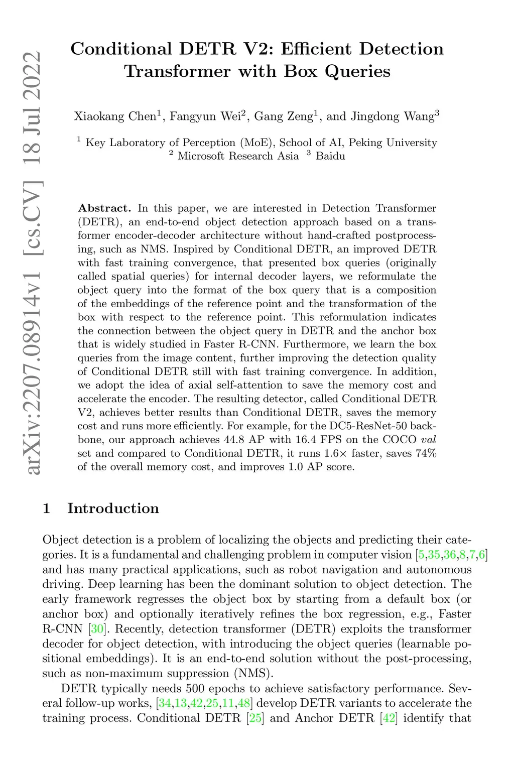In this paper, we are interested in Detection Transformer (DETR), an end-to-end object detection approach based on a transformer encoder-decoder architecture without hand-crafted postprocessing, such as NMS. Inspired by Conditional DETR, an improved DETR with fast training convergence, that presented box queries (originally called spatial queries) for internal decoder layers, we reformulate the object query into the format of the box query that is a composition of the embeddings of the reference point and the transformation of the box with respect to the reference point. This reformulation indicates the connection between the object query in DETR and the anchor box that is widely studied in Faster R-CNN. Furthermore, we learn the box queries from the image content, further improving the detection quality of Conditional DETR still with fast training convergence. In addition, we adopt the idea of axial self-attention to save the memory cost and accelerate the encoder. The resulting detector, called Conditional DETR V2, achieves better results than Conditional DETR, saves the memory cost and runs more efficiently. For example, for the DC-ResNet- backbone, our approach achieves AP with FPS on the COCO set and compared to Conditional DETR, it runs faster, saves \% of the overall memory cost, and improves AP score.