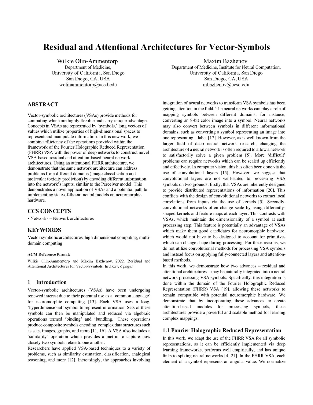 Vector-symbolic architectures (VSAs) provide methods for computing which are highly flexible and carry unique advantages. Concepts in VSAs are represented by 'symbols,' long vectors of values which utilize properties of high-dimensional spaces to represent and manipulate information. In this new work, we combine efficiency of the operations provided within the framework of the Fourier Holographic Reduced Representation (FHRR) VSA with the power of deep networks to construct novel VSA based residual and attention-based neural network architectures. Using an attentional FHRR architecture, we demonstrate that the same network architecture can address problems from different domains (image classification and molecular toxicity prediction) by encoding different information into the network's inputs, similar to the Perceiver model. This demonstrates a novel application of VSAs and a potential path to implementing state-of-the-art neural models on neuromorphic hardware.
