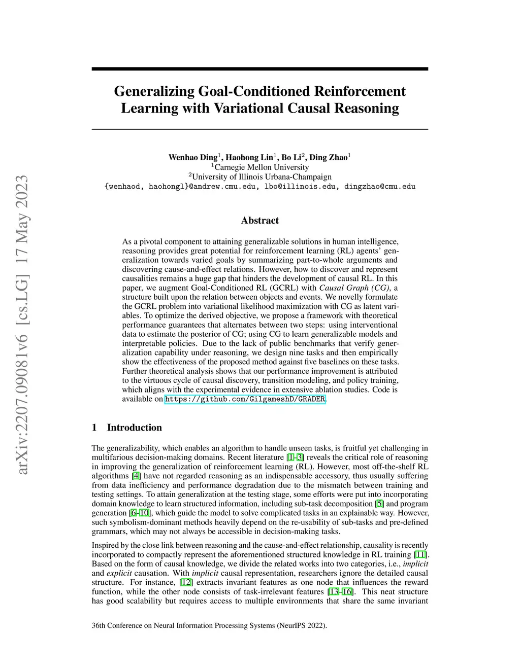 As a pivotal component to attaining generalizable solutions in human intelligence, reasoning provides great potential for reinforcement learning (RL) agents' generalization towards varied goals by summarizing part-to-whole arguments and discovering cause-and-effect relations. However, how to discover and represent causalities remains a huge gap that hinders the development of causal RL. In this paper, we augment Goal-Conditioned RL (GCRL) with Causal Graph (CG), a structure built upon the relation between objects and events. We novelly formulate the GCRL problem into variational likelihood maximization with CG as latent variables. To optimize the derived objective, we propose a framework with theoretical performance guarantees that alternates between two steps: using interventional data to estimate the posterior of CG; using CG to learn generalizable models and interpretable policies. Due to the lack of public benchmarks that verify generalization capability under reasoning, we design nine tasks and then empirically show the effectiveness of the proposed method against five baselines on these tasks. Further theoretical analysis shows that our performance improvement is attributed to the virtuous cycle of causal discovery, transition modeling, and policy training, which aligns with the experimental evidence in extensive ablation studies.