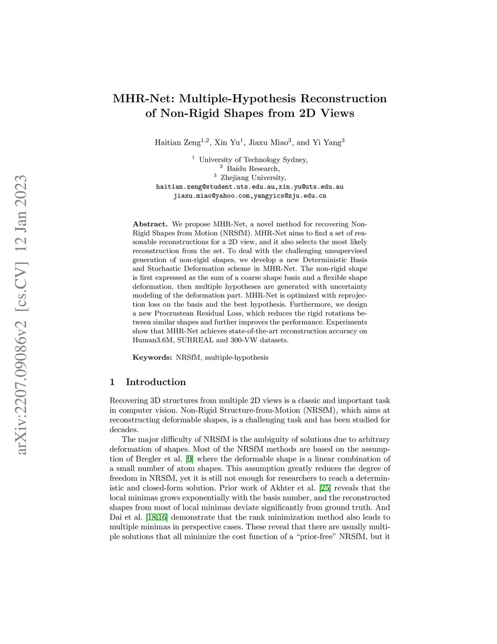 We propose MHR-Net, a novel method for recovering Non-Rigid Shapes from Motion (NRSfM). MHR-Net aims to find a set of reasonable reconstructions for a 2D view, and it also selects the most likely reconstruction from the set. To deal with the challenging unsupervised generation of non-rigid shapes, we develop a new Deterministic Basis and Stochastic Deformation scheme in MHR-Net. The non-rigid shape is first expressed as the sum of a coarse shape basis and a flexible shape deformation, then multiple hypotheses are generated with uncertainty modeling of the deformation part. MHR-Net is optimized with reprojection loss on the basis and the best hypothesis. Furthermore, we design a new Procrustean Residual Loss, which reduces the rigid rotations between similar shapes and further improves the performance. Experiments show that MHR-Net achieves state-of-the-art reconstruction accuracy on Human3.6M, SURREAL and 300-VW datasets.