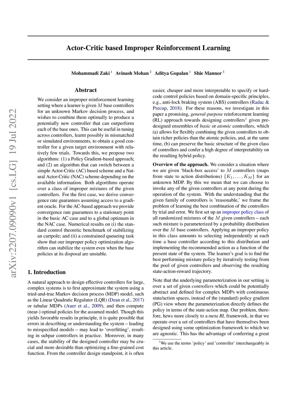 We consider an improper reinforcement learning setting where a learner is given base controllers for an unknown Markov decision process, and wishes to combine them optimally to produce a potentially new controller that can outperform each of the base ones. This can be useful in tuning across controllers, learnt possibly in mismatched or simulated environments, to obtain a good controller for a given target environment with relatively few trials. Towards this, we propose two algorithms: (1) a Policy Gradient-based approach; and (2) an algorithm that can switch between a simple Actor-Critic (AC) based scheme and a Natural Actor-Critic (NAC) scheme depending on the available information. Both algorithms operate over a class of improper mixtures of the given controllers. For the first case, we derive convergence rate guarantees assuming access to a gradient oracle. For the AC-based approach we provide convergence rate guarantees to a stationary point in the basic AC case and to a global optimum in the NAC case. Numerical results on (i) the standard control theoretic benchmark of stabilizing an cartpole; and (ii) a constrained queueing task show that our improper policy optimization algorithm can stabilize the system even when the base policies at its disposal are unstable.
