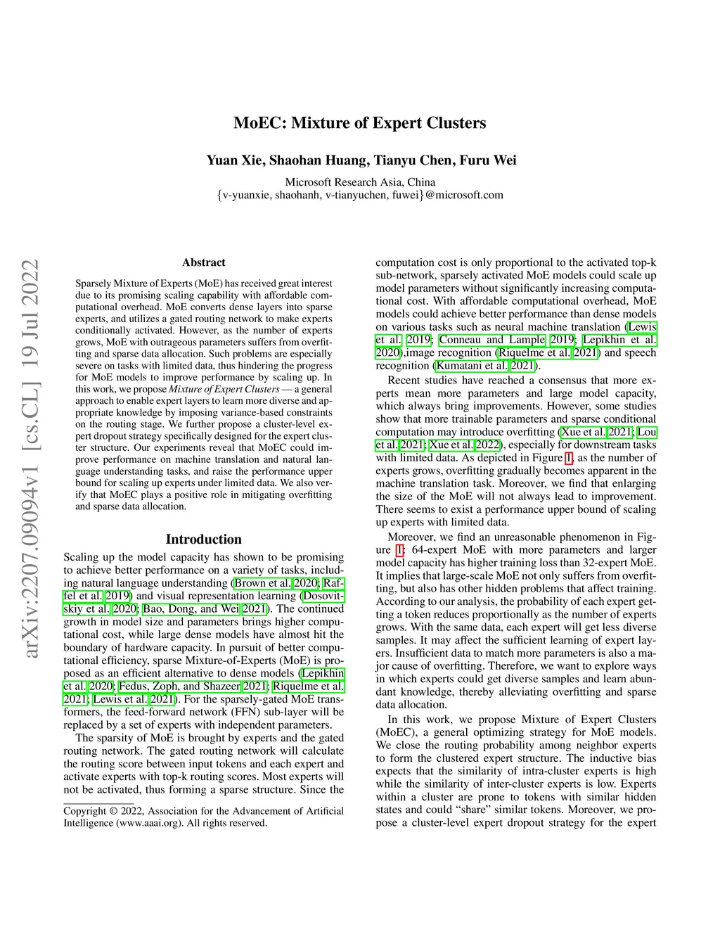 Sparsely Mixture of Experts (MoE) has received great interest due to its promising scaling capability with affordable computational overhead. MoE converts dense layers into sparse experts, and utilizes a gated routing network to make experts conditionally activated. However, as the number of experts grows, MoE with outrageous parameters suffers from overfitting and sparse data allocation. Such problems are especially severe on tasks with limited data, thus hindering the progress for MoE models to improve performance by scaling up. In this work, we propose Mixture of Expert Clusters - a general approach to enable expert layers to learn more diverse and appropriate knowledge by imposing variance-based constraints on the routing stage. We further propose a cluster-level expert dropout strategy specifically designed for the expert cluster structure. Our experiments reveal that MoEC could improve performance on machine translation and natural language understanding tasks, and raise the performance upper bound for scaling up experts under limited data. We also verify that MoEC plays a positive role in mitigating overfitting and sparse data allocation.