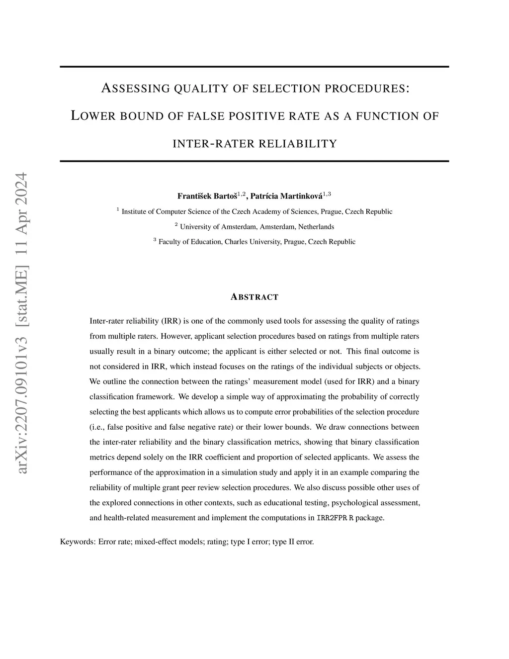 Inter-rater reliability (IRR) is one of the commonly used tools for assessing the quality of ratings from multiple raters. However, applicant selection procedures based on ratings from multiple raters usually result in a binary outcome; the applicant is either selected or not. This final outcome is not considered in IRR, which instead focuses on the ratings of the individual subjects or objects. We outline the connection between the ratings' measurement model (used for IRR) and a binary classification framework. We develop a simple way of approximating the probability of correctly selecting the best applicants which allows us to compute error probabilities of the selection procedure (i.e., false positive and false negative rate) or their lower bounds. We draw connections between the inter-rater reliability and the binary classification metrics, showing that binary classification metrics depend solely on the IRR coefficient and proportion of selected applicants. We assess the performance of the approximation in a simulation study and apply it in an example comparing the reliability of multiple grant peer review selection procedures. We also discuss possible other uses of the explored connections in other contexts, such as educational testing, psychological assessment, and health-related measurement and implement the computations in IRR2FPR R package.