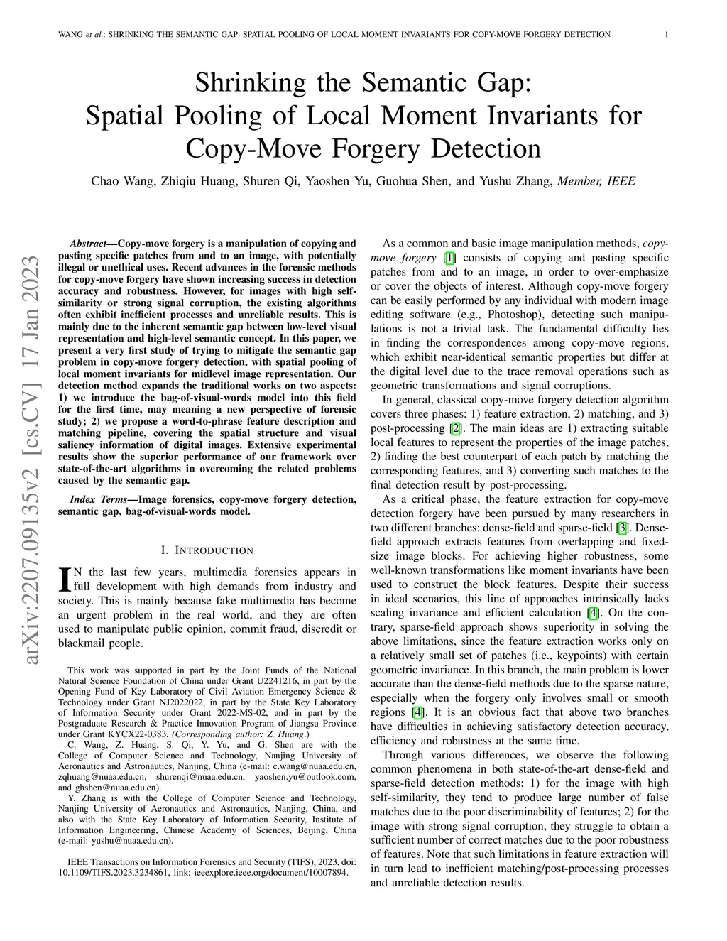 Copy-move forgery is a manipulation of copying and pasting specific patches from and to an image, with potentially illegal or unethical uses. Recent advances in the forensic methods for copy-move forgery have shown increasing success in detection accuracy and robustness. However, for images with high self-similarity or strong signal corruption, the existing algorithms often exhibit inefficient processes and unreliable results. This is mainly due to the inherent semantic gap between low-level visual representation and high-level semantic concept. In this paper, we present a very first study of trying to mitigate the semantic gap problem in copy-move forgery detection, with spatial pooling of local moment invariants for midlevel image representation. Our detection method expands the traditional works on two aspects: 1) we introduce the bag-of-visual-words model into this field for the first time, may meaning a new perspective of forensic study; 2) we propose a word-to-phrase feature description and matching pipeline, covering the spatial structure and visual saliency information of digital images. Extensive experimental results show the superior performance of our framework over state-of-the-art algorithms in overcoming the related problems caused by the semantic gap.