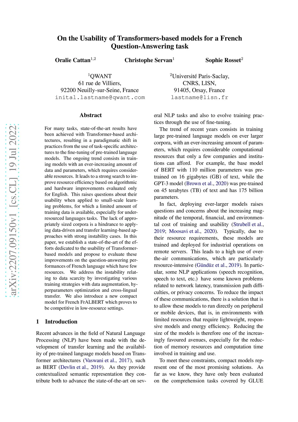 For many tasks, state-of-the-art results have been achieved with Transformer-based architectures, resulting in a paradigmatic shift in practices from the use of task-specific architectures to the fine-tuning of pre-trained language models. The ongoing trend consists in training models with an ever-increasing amount of data and parameters, which requires considerable resources. It leads to a strong search to improve resource efficiency based on algorithmic and hardware improvements evaluated only for English. This raises questions about their usability when applied to small-scale learning problems, for which a limited amount of training data is available, especially for under-resourced languages tasks. The lack of appropriately sized corpora is a hindrance to applying data-driven and transfer learning-based approaches with strong instability cases. In this paper, we establish a state-of-the-art of the efforts dedicated to the usability of Transformer-based models and propose to evaluate these improvements on the question-answering performances of French language which have few resources. We address the instability relating to data scarcity by investigating various training strategies with data augmentation, hyperparameters optimization and cross-lingual transfer. We also introduce a new compact model for French FrALBERT which proves to be competitive in low-resource settings.