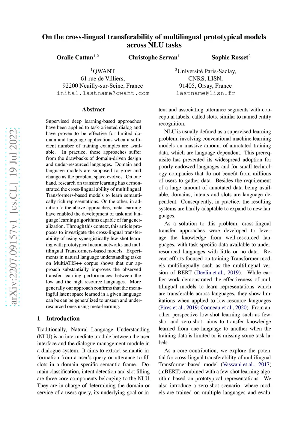 Supervised deep learning-based approaches have been applied to task-oriented dialog and have proven to be effective for limited domain and language applications when a sufficient number of training examples are available. In practice, these approaches suffer from the drawbacks of domain-driven design and under-resourced languages. Domain and language models are supposed to grow and change as the problem space evolves. On one hand, research on transfer learning has demonstrated the cross-lingual ability of multilingual Transformers-based models to learn semantically rich representations. On the other, in addition to the above approaches, meta-learning have enabled the development of task and language learning algorithms capable of far generalization. Through this context, this article proposes to investigate the cross-lingual transferability of using synergistically few-shot learning with prototypical neural networks and multilingual Transformers-based models. Experiments in natural language understanding tasks on MultiATIS++ corpus shows that our approach substantially improves the observed transfer learning performances between the low and the high resource languages. More generally our approach confirms that the meaningful latent space learned in a given language can be can be generalized to unseen and under-resourced ones using meta-learning.