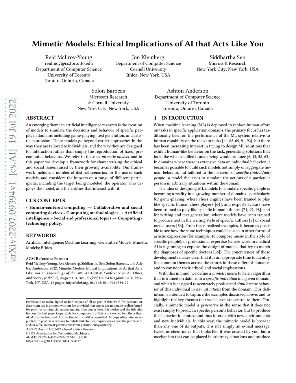 An emerging theme in artificial intelligence research is the creation of models to simulate the decisions and behavior of specific people, in domains including game-playing, text generation, and artistic expression. These models go beyond earlier approaches in the way they are tailored to individuals, and the way they are designed for interaction rather than simply the reproduction of fixed, pre-computed behaviors. We refer to these as mimetic models, and in this paper we develop a framework for characterizing the ethical and social issues raised by their growing availability. Our framework includes a number of distinct scenarios for the use of such models, and considers the impacts on a range of different participants, including the target being modeled, the operator who deploys the model, and the entities that interact with it.