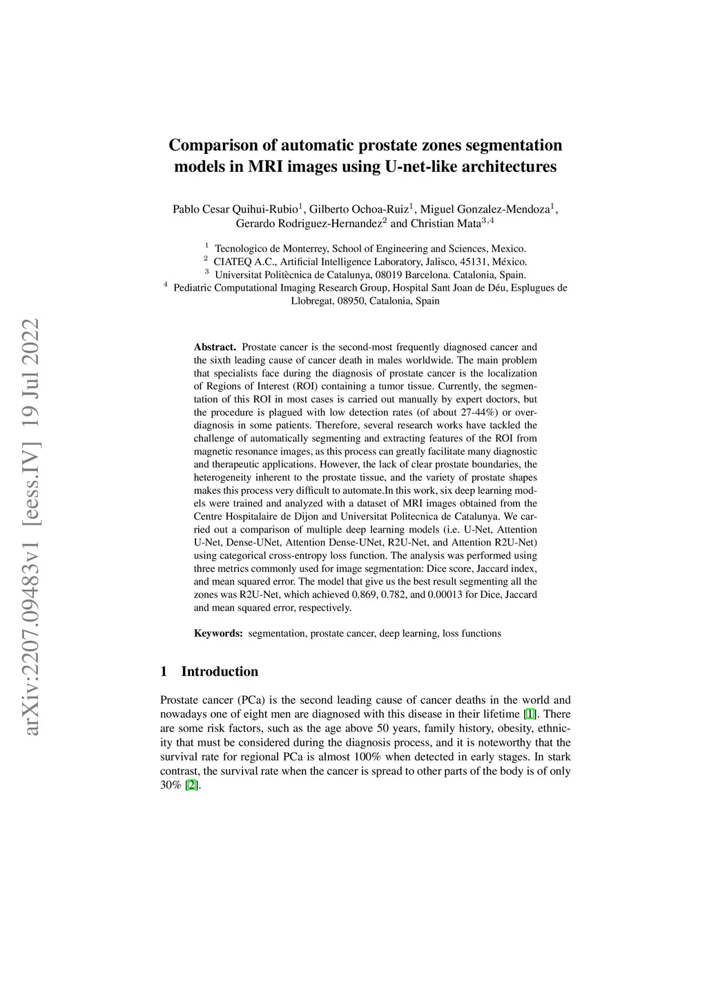 Prostate cancer is the second-most frequently diagnosed cancer and the sixth leading cause of cancer death in males worldwide. The main problem that specialists face during the diagnosis of prostate cancer is the localization of Regions of Interest (ROI) containing a tumor tissue. Currently, the segmentation of this ROI in most cases is carried out manually by expert doctors, but the procedure is plagued with low detection rates (of about 27-44%) or overdiagnosis in some patients. Therefore, several research works have tackled the challenge of automatically segmenting and extracting features of the ROI from magnetic resonance images, as this process can greatly facilitate many diagnostic and therapeutic applications. However, the lack of clear prostate boundaries, the heterogeneity inherent to the prostate tissue, and the variety of prostate shapes makes this process very difficult to automate.In this work, six deep learning models were trained and analyzed with a dataset of MRI images obtained from the Centre Hospitalaire de Dijon and Universitat Politecnica de Catalunya. We carried out a comparison of multiple deep learning models (i.e. U-Net, Attention U-Net, Dense-UNet, Attention Dense-UNet, R2U-Net, and Attention R2U-Net) using categorical cross-entropy loss function. The analysis was performed using three metrics commonly used for image segmentation: Dice score, Jaccard index, and mean squared error. The model that give us the best result segmenting all the zones was R2U-Net, which achieved 0.869, 0.782, and 0.00013 for Dice, Jaccard and mean squared error, respectively.