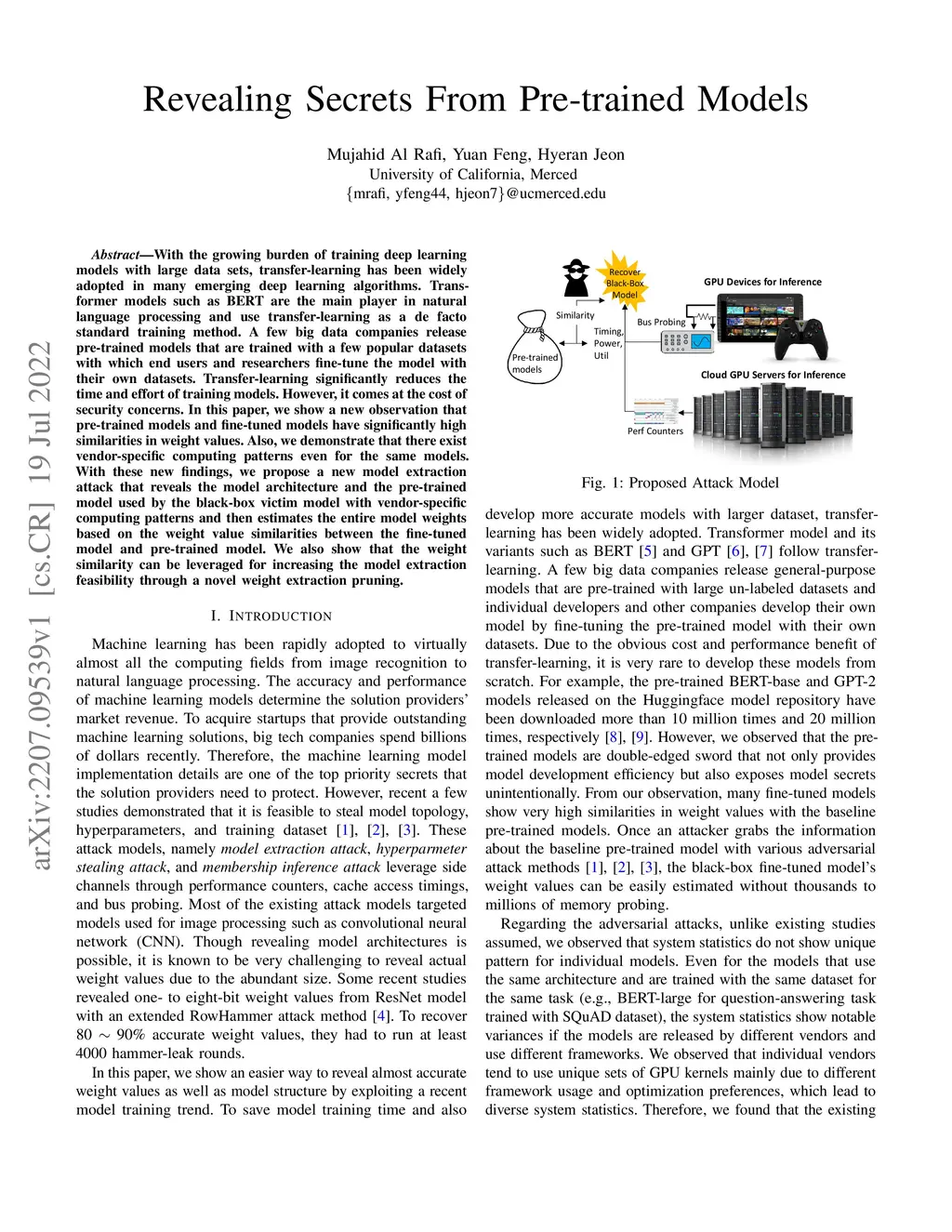 With the growing burden of training deep learning models with large data sets, transfer-learning has been widely adopted in many emerging deep learning algorithms. Transformer models such as BERT are the main player in natural language processing and use transfer-learning as a de facto standard training method. A few big data companies release pre-trained models that are trained with a few popular datasets with which end users and researchers fine-tune the model with their own datasets. Transfer-learning significantly reduces the time and effort of training models. However, it comes at the cost of security concerns. In this paper, we show a new observation that pre-trained models and fine-tuned models have significantly high similarities in weight values. Also, we demonstrate that there exist vendor-specific computing patterns even for the same models. With these new findings, we propose a new model extraction attack that reveals the model architecture and the pre-trained model used by the black-box victim model with vendor-specific computing patterns and then estimates the entire model weights based on the weight value similarities between the fine-tuned model and pre-trained model. We also show that the weight similarity can be leveraged for increasing the model extraction feasibility through a novel weight extraction pruning.