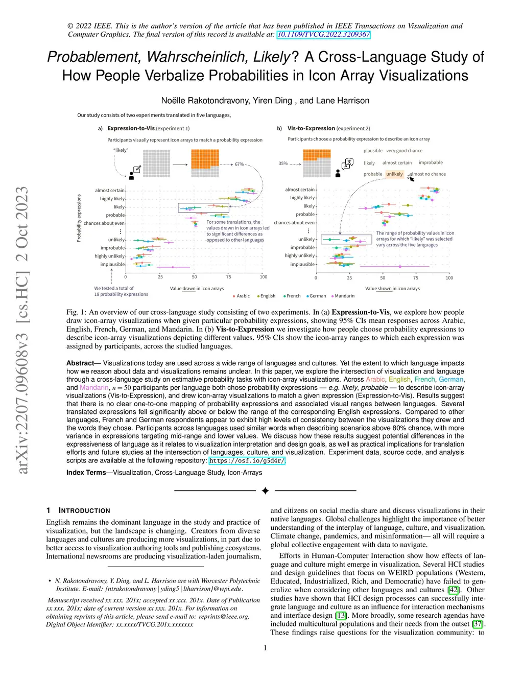 Visualizations today are used across a wide range of languages and cultures. Yet the extent to which language impacts how we reason about data and visualizations remains unclear. In this paper, we explore the intersection of visualization and language through a cross-language study on estimative probability tasks with icon-array visualizations. Across Arabic, English, French, German, and Mandarin, n = 50 participants per language both chose probability expressions - e.g. likely, probable - to describe icon-array visualizations (Vis-to-Expression), and drew icon-array visualizations to match a given expression (Expression-to-Vis). Results suggest that there is no clear one-to-one mapping of probability expressions and associated visual ranges between languages. Several translated expressions fell significantly above or below the range of the corresponding English expressions. Compared to other languages, French and German respondents appear to exhibit high levels of consistency between the visualizations they drew and the words they chose. Participants across languages used similar words when describing scenarios above 80% chance, with more variance in expressions targeting mid-range and lower values. We discuss how these results suggest potential differences in the expressiveness of language as it relates to visualization interpretation and design goals, as well as practical implications for translation efforts and future studies at the intersection of languages, culture, and visualization. Experiment data, source code, and analysis scripts are available at the following repository: https://osf.io/g5d4r/.