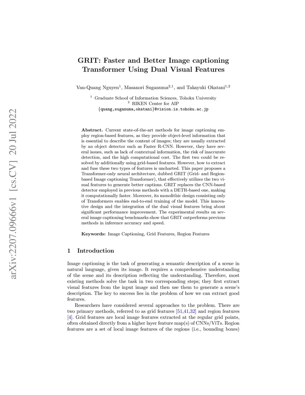 Current state-of-the-art methods for image captioning employ region-based features, as they provide object-level information that is essential to describe the content of images; they are usually extracted by an object detector such as Faster R-CNN. However, they have several issues, such as lack of contextual information, the risk of inaccurate detection, and the high computational cost. The first two could be resolved by additionally using grid-based features. However, how to extract and fuse these two types of features is uncharted. This paper proposes a Transformer-only neural architecture, dubbed GRIT (Grid- and Region-based Image captioning Transformer), that effectively utilizes the two visual features to generate better captions. GRIT replaces the CNN-based detector employed in previous methods with a DETR-based one, making it computationally faster. Moreover, its monolithic design consisting only of Transformers enables end-to-end training of the model. This innovative design and the integration of the dual visual features bring about significant performance improvement. The experimental results on several image captioning benchmarks show that GRIT outperforms previous methods in inference accuracy and speed.