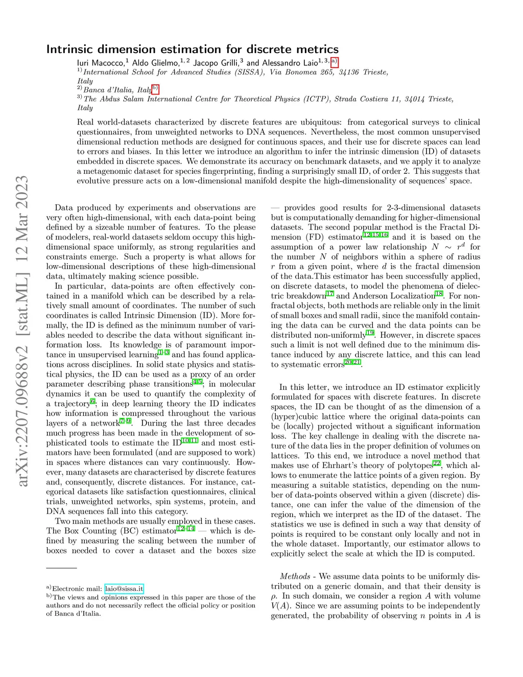Real world-datasets characterized by discrete features are ubiquitous: from categorical surveys to clinical questionnaires, from unweighted networks to DNA sequences. Nevertheless, the most common unsupervised dimensional reduction methods are designed for continuous spaces, and their use for discrete spaces can lead to errors and biases. In this letter we introduce an algorithm to infer the intrinsic dimension (ID) of datasets embedded in discrete spaces. We demonstrate its accuracy on benchmark datasets, and we apply it to analyze a metagenomic dataset for species fingerprinting, finding a surprisingly small ID, of order 2. This suggests that evolutive pressure acts on a low-dimensional manifold despite the high-dimensionality of sequences' space.