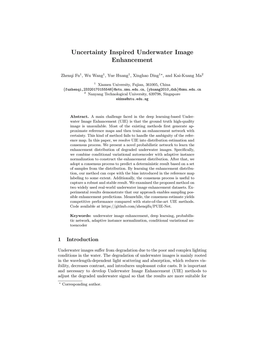 A main challenge faced in the deep learning-based Underwater Image Enhancement (UIE) is that the ground truth high-quality image is unavailable. Most of the existing methods first generate approximate reference maps and then train an enhancement network with certainty. This kind of method fails to handle the ambiguity of the reference map. In this paper, we resolve UIE into distribution estimation and consensus process. We present a novel probabilistic network to learn the enhancement distribution of degraded underwater images. Specifically, we combine conditional variational autoencoder with adaptive instance normalization to construct the enhancement distribution. After that, we adopt a consensus process to predict a deterministic result based on a set of samples from the distribution. By learning the enhancement distribution, our method can cope with the bias introduced in the reference map labeling to some extent. Additionally, the consensus process is useful to capture a robust and stable result. We examined the proposed method on two widely used real-world underwater image enhancement datasets. Experimental results demonstrate that our approach enables sampling possible enhancement predictions. Meanwhile, the consensus estimate yields competitive performance compared with state-of-the-art UIE methods. Code available at https://github.com/zhenqifu/PUIE-Net.