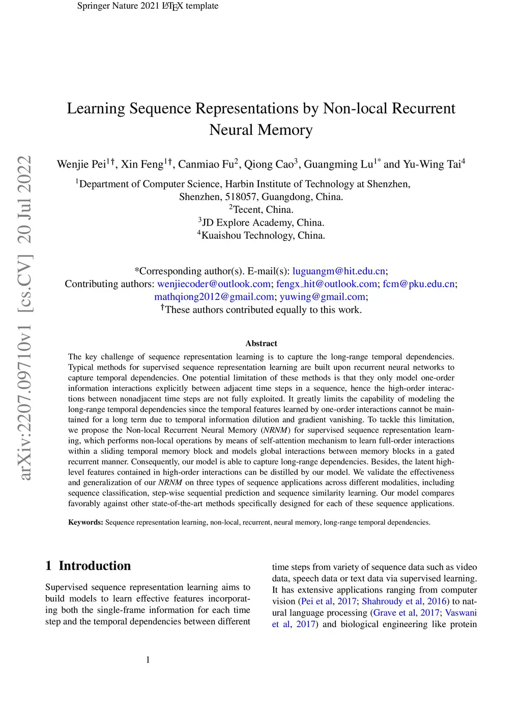Learning Sequence Representations by Non-local Recurrent Neural Memory